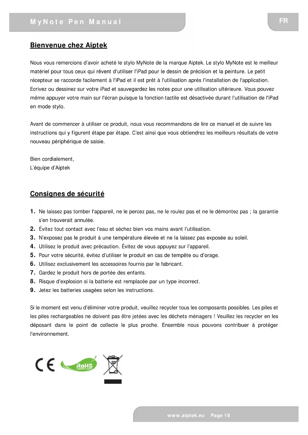 Version : 2.0MyNote Pen Manual www.aiptek.eu Page 18 Bienvenue chez Aiptek Nous vous remercions d’avoir acheté le stylo MyNote de la marque Aiptek.Le stylo MyNote est le meilleur matériel pour tous ceux qui rêvent d'utiliser l'iPad pour le dessin de précision et la peinture. Le petit récepteur se raccorde facilement à l'iPad et il est prêt à l'utilisation après l'installation de l'application. Ecrivez ou dessinez sur votre iPad et sauvegardez les notes pour une utilisation ultérieure. Vous pouvez même appuyer votre main sur l'écran puisque la fonction tactile est désactivée durant l'utilisation de l'iPad en mode stylo. Avant de commencer à utiliser ce produit, nous vous recommandons de lire ce manuel et de suivre les instructions qui y figurent étape par étape. C’est ainsi que vous obtiendrez les meilleurs résultats de votre nouveau périphérique de saisie. Bien cordialement, L’équipe d’Aiptek