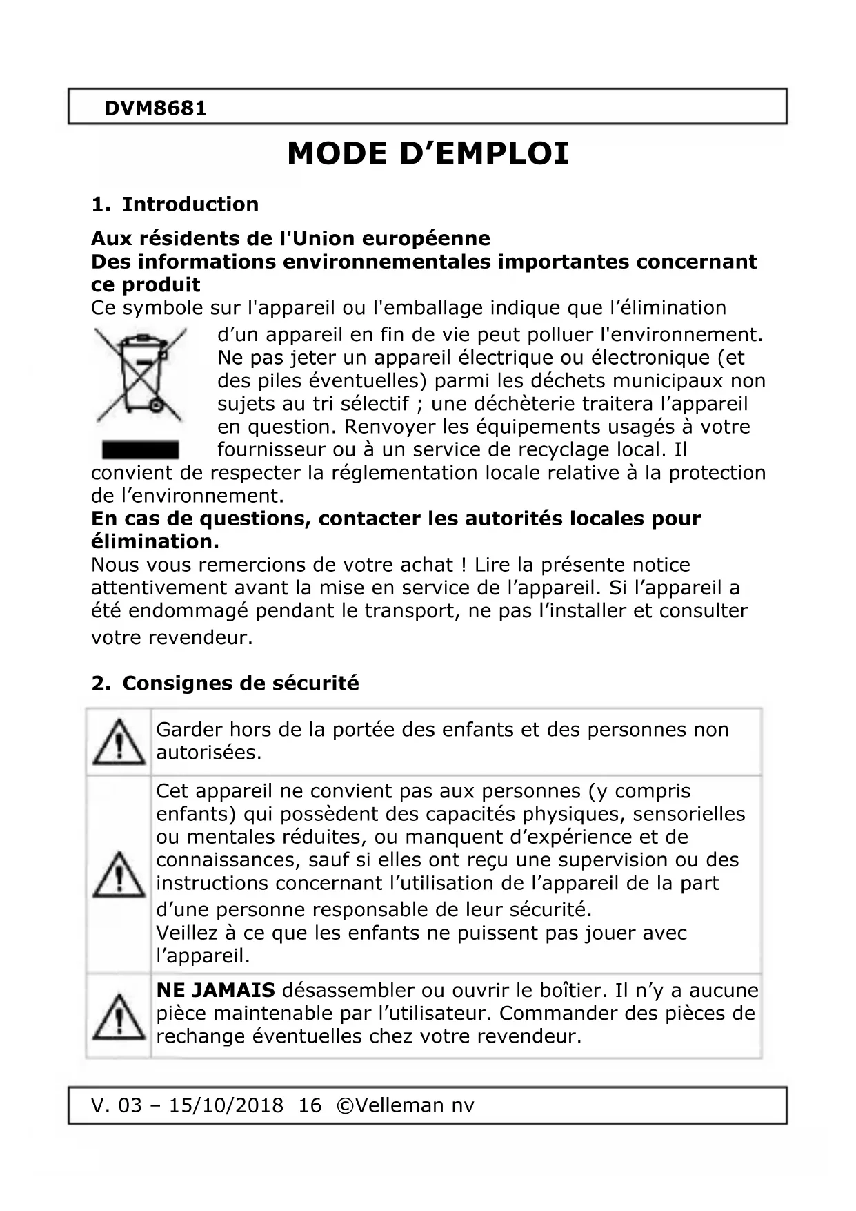 Retrouvez gratuitement la notice de l'appareil DVM8681 VELLEMAN au format PDF.