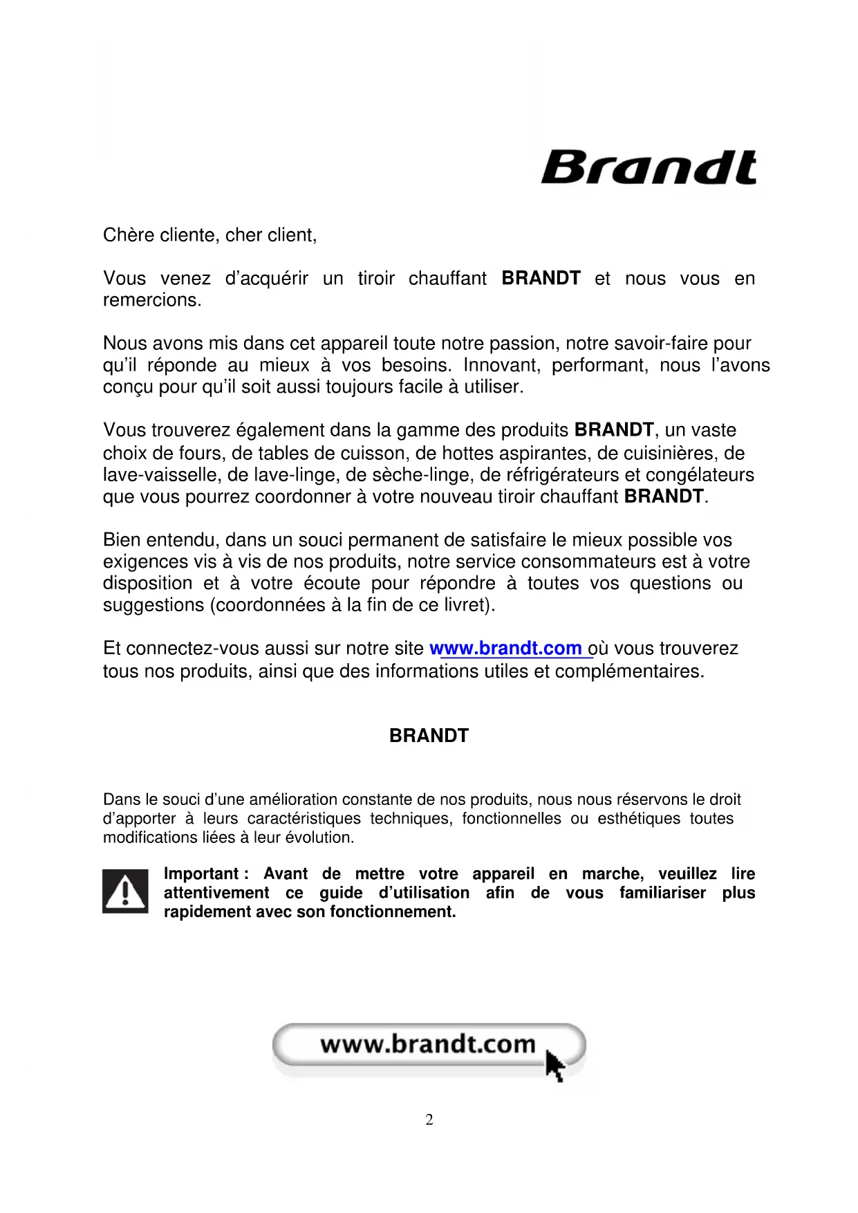 Chère cliente, cher client, Vous venez d’acquérir un tiroir chauffant BRANDT et nous vous en remercions. Nous avons mis dans cet appareil toute notre passion, notre savoir-faire pour qu’il réponde au mieux à vos besoins. Innovant, performant, nous l’avons conçu pour qu’il soit aussi toujours facile à utiliser. Vous trouverez également dans la gamme des produits BRANDT, un vaste choix de fours, de tables de cuisson, de hottes aspirantes, de cuisinières, de lave-vaisselle, de lave-linge, de sèche-linge, de réfrigérateurs et congélateurs que vous pourrez coordonner à votre nouveau tiroir chauffant BRANDT. Bien entendu, dans un souci permanent de satisfaire le mieux possible vos exigences vis à vis de nos produits, notre service consommateurs est à votre disposition et à votre écoute pour répondre à toutes vos questions ou suggestions (coordonnées à la fin de ce livret). Et connectez-vous aussi sur notre site www.brandt.com où vous trouverez tous nos produits, ainsi que des informations utiles et complémentaires.