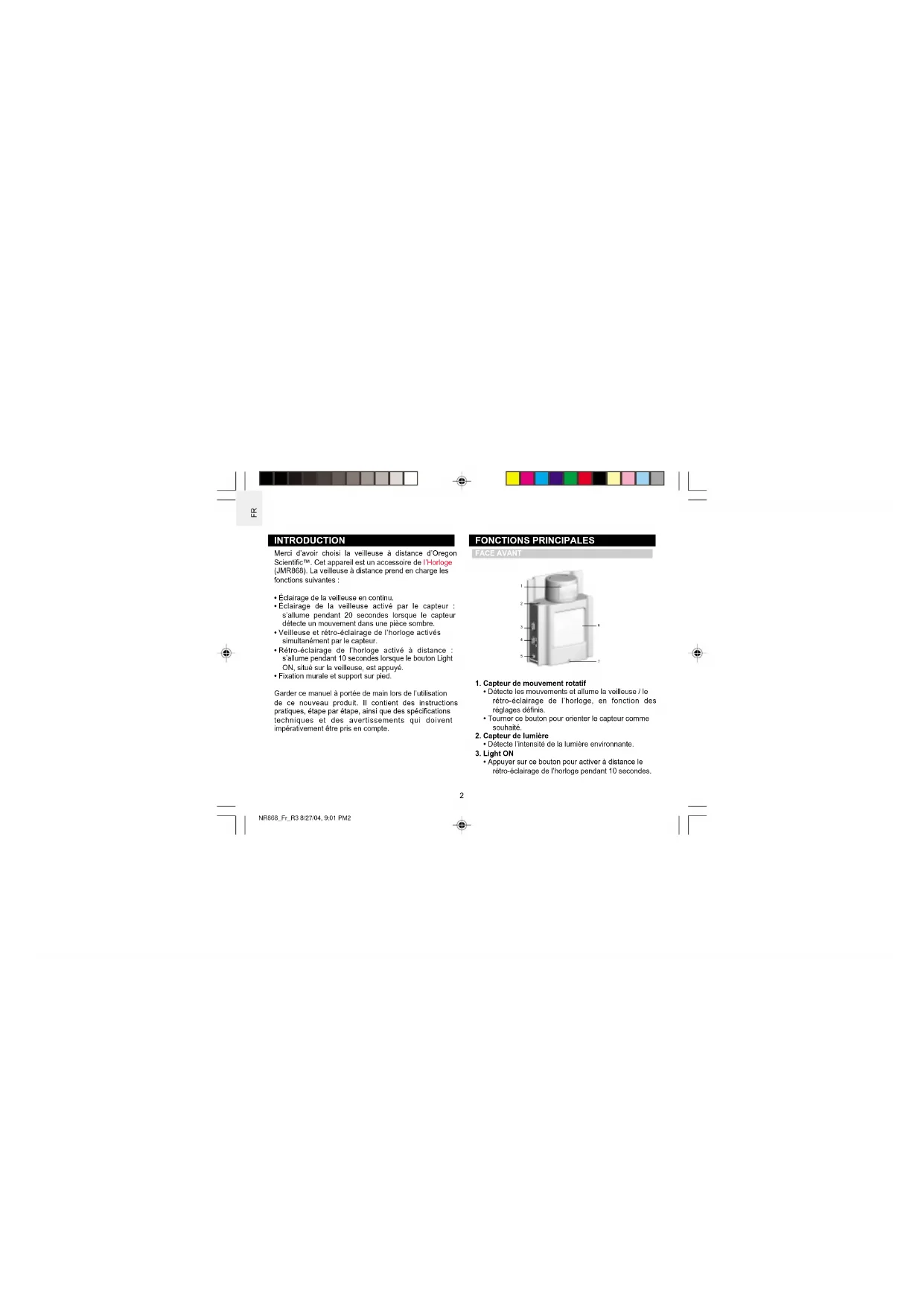INTRODUCTION Merci d’avoir choisi la veilleuse à distance d’Oregon Scientific™. Cet appareil est un accessoire de I’Horloge (JMR868). La veilleuse à distance prend en charge les fonctions suivantes :