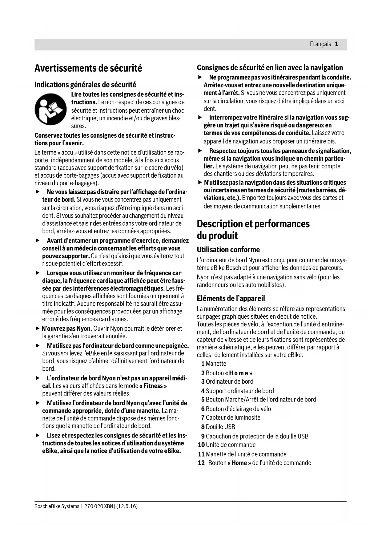 Software version error Contact your Bosch eBike dealer so that he can perform a software update. 7xx Transmission error Please observe the operating instructions provided by the transmission manufacturer. No display Internal error of the on-board computer Restart your eBike system by switching it off and back on. Code Cause Corrective MeasureEnglish–12 1 270 020 XBN | (12.5.16) Bosch eBike Systems Power Supply of External Devices via USB Connection With the USB connection, it is possible to operate and charge most devices whose power supply is possible via USB (e.g., various mobile phones). Prerequisite for charging is that the on-board computer and a sufficiently charged battery pack are inserted in the eBike. Open the protective cap 9 of the USB port on the on-board computer. Connect the USB connection of the external device to the USB port 8 on the on-board computer using the USB charging cable Micro A – Micro B (available from your Bosch eBike dealer). Once the consumer has been disconnected, the USB connec- tion must be sealed again carefully with the protective cap 9. USB connections are not a waterproof. When cycling in the rain, do not connect any external devices and make sure that the USB port is fully covered by the protective cap 9. Attention: Users connected to Nyon can affect the range of the eBike. Notes on Riding with the eBike System Careful Handling of the eBike Please observe the operating and storage temperatures of the eBike components. Protect the drive unit, on-board computer and battery against extreme temperatures (e.g. from intense sunlight without adequate ventilation). The components (es- pecially the battery pack) can become damaged through ex- treme temperatures. Keep the screen of your Nyon clean. Dirt can cause faulty brightness detection. The day/night switch-over in the navi- gation mode can be distorted. An abrupt change of environmental conditions, can cause the screen to fog up from inside. After a short time, a temperature adjustment takes place and the fog disappears. Maintenance and Service Maintenance and Cleaning Do not immerse any components, including the drive unit, in water or clean them with pressurised water. Clean your on-board computer using a soft cloth dampened only with water. Do not use any detergents. Have your eBike system checked by an expert at least once a year (including mechanical parts, up-to-dateness of system software). The bicycle manufacturer or dealer may also base the service date on the distance travelled and/or a period of time. In this case, the on-board computer displays a message telling you when the service date is due for four seconds after each time it is switched on. For service or repairs on the eBike, please refer to an author- ised bicycle dealer. Have all repairs performed only by an authorised bike dealer. After-sales Service and Application Service In case of questions concerning the eBike system and its com- ponents, please refer to an authorised Bosch eBike dealer. For contact data of authorised Bosch eBike dealers, please refer to www.bosch-ebike.com Transport If you transport your eBike attached to the outside of your car, e.g. on a bike rack, remove the on-board com- puter and the PowerPack to avoid damaging them. Disposal The drive unit, on-board computer including operat- ing unit, battery pack, speed sensor, accessories and packaging should be disposed of in an environmental- ly correct manner. Do not dispose of eBikes and their components into house- hold waste! Only for EC countries: According to the European Guideline 2012/19/EU, electrical devices/tools that are no longer usable, and according to the European Guideline 2006/66/EC, defective or used bat- tery packs/batteries, must be collected sepa- rately and disposed of in an environmentally cor- rect manner. The integrated battery pack in the on-board computer may only be removed for disposal. Opening the housing shell can destroy the on-board computer. Please return battery packs and on-board computers that are no longer usable to an authorised bicycle dealer. Li-ion: Please observe the instructions in sec- tion “Transport”, page English–12. Subject to change without notice.Français–1 Bosch eBike Systems 1 270 020 XBN | (12.5.16) Avertissements de sécurité Indications générales de sécurité Lire toutes les consignes de sécurité et ins- tructions. Le non-respect de ces consignes de sécurité et instructions peut entraîner un choc électrique, un incendie et/ou de graves bles- sures. Conservez toutes les consignes de sécurité et instruc- tions pour l’avenir. Le terme « accu » utilisé dans cette notice d’utilisation se rap- porte, indépendamment de son modèle, à la fois aux accus standard (accus avec support de fixation sur le cadre du vélo) et accus de porte-bagages (accus avec support de fixation au niveau du porte-bagages). Ne vous laissez pas distraire par l’affichage de l’ordina- teur de bord. Si vous ne vous concentrez pas uniquement sur la circulation, vous risquez d’être impliqué dans un acci- dent. Si vous souhaitez procéder au changement du niveau d’assistance et saisir des entrées dans votre ordinateur de bord, arrêtez-vous et entrez les données appropriées. Avant d’entamer un programme d’exercice, demandez conseil à un médecin concernant les efforts que vous pouvez supporter. Ce n’est qu’ainsi que vous éviterez tout risque potentiel d’effort excessif. Lorsque vous utilisez un moniteur de fréquence car- diaque, la fréquence cardiaque affichée peut être faus- sée par des interférences électromagnétiques. Les fré- quences cardiaques affichées sont fournies uniquement à titre indicatif. Aucune responsabilité ne saurait être assu- mée pour les conséquences provoquées par un affichage erroné des fréquences cardiaques. N’ouvrez pas Nyon. Ouvrir Nyon pourrait le détériorer et la garantie s’en trouverait annulée. N’utilisez pas l’ordinateur de bord co