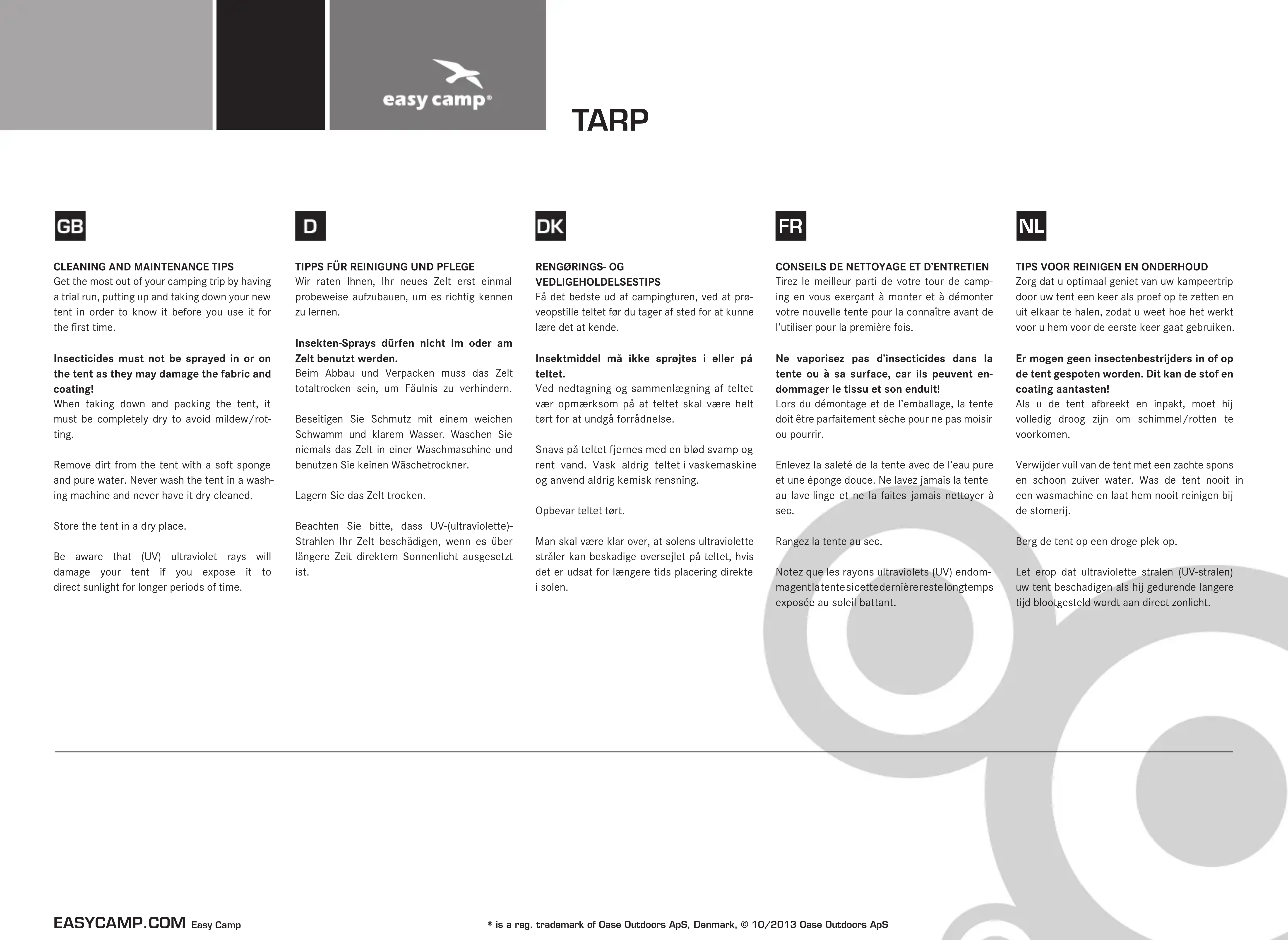 Tirez le meilleur parti de votre tour de camp- ing en vous exerçant à monter et à démonter votre nouvelle tente pour la connaître avant de l’utiliser pour la première fois. Ne vaporisez pas d’insecticides dans la tente ou à sa surface, car ils peuvent en- dommager le tissu et son enduit! Lors du démontage et de l’emballage, la tente doit être parfaitement sèche pour ne pas moisir ou pourrir. Enlevez la saleté de la tente avec de l’eau pure et une éponge douce. Ne lavez jamais la tente au lave-linge et ne la faites jamais nettoyer à sec. Rangez la tente au sec. Notez que les rayons ultraviolets (UV) endom- magent la tente si cette dernière reste longtemps exposée au soleil battant.