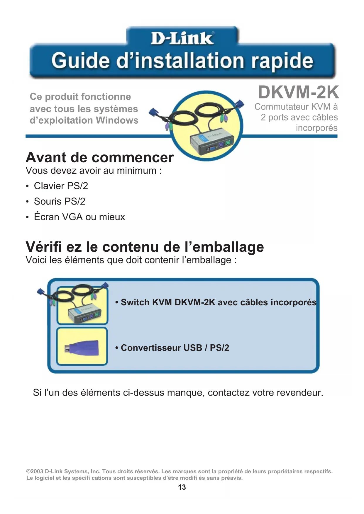 - Convertisseur USB / PS/2 ©2003 D-Link Systems, Inc. Tous droits réservés. Les marques sont la propriété de leurs propriétaires respectifs. Le logiciel et les spécifi cations sont susceptibles d’être modifi és sans préavis. Si l’un des éléments ci-dessus manque, contactez votre revendeur.14 Installation du DKVM-2K Reliez le connecteur de clavier mâle PS/2 6 points de votre ordinateur au port clavier du DKVM-2K. Reliez le connecteur VGA HDDB 15 de votre écran au port console du DKVM-2K. Reliez le connecteur de souris mâle PS/2 6 points de votre ordinateur au port souris du DKVM-2K. Avant d’installer le DKVM-2K, vérifiez que tous vos ordinateurs sont éteints afin d’éviter les erreurs de souris et de clavier au démarrage de vos ordinateurs.15 Type A Connectez le câble d’écran incorporé du DKVM-2K au port VGA situé à l’arrière de votre ordinateur. Connectez le câble de souris incorporé du DKVM-2K au port souris PS/2 situé à l’arrière de votre ordinateur. Connectez le câble de clavier incorporé du DKVM-2K au port clavier PS/2 situé à l’arrière de votre ordinateur. Une fois que vous avez terminé l’installation du DKVM-2K, allumez tous les ordinateurs. Les opérations suivantes s’appliquent aux deux ordinateurs que vous utilisez avec votre DKVM-2K. Installation du DKVM-2K16 Basculement d’un ordinateur sur l’autre avec le DKVM-2K Pour basculer rapidement et facilement d’un ordinateur sur l’autre, vous pouvez vous servir du bouton de sélection situé à l’avant du DKVM-2K ou d’une combinaison de touches de votre clavier. Bouton de Sélection Vous pouvez aussi vous servir de votre clavier pour basculer d’un ordinateur sur l’autre. Appuyez deux fois sur la touche Arrêt défi l pour passer en mode commande. Un bip est émis pour vous confi rmer le passage en mode commande. Menu des combinaisons de touches Arrêt défi l + Arrêt défi l + 1 : Basculement sur le PC 1 Arrêt défi l + Arrêt défi l + 2 : Basculement sur le PC 2 Arrêt défi l + Arrêt défi l + S : Passage en mode AutoScan. Les ordinateurs se succèdent sur l’écran toutes les 10 secondes. Arrêt défi l + Arrêt défi l + Echap : Sortie du mode AutoScan et du mode Commande.17 Dépannage Clavier Si votre clavier ne fonctionne pas, n’est pas détecté ou si une erreur clavier est signalée à la réinitialisation, effectuez les vérifications suivantes :