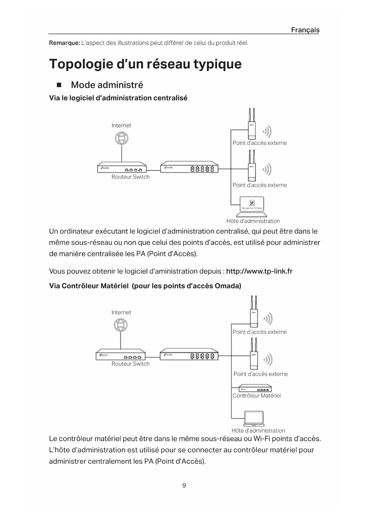 Remarque: L’aspect des illustrations peut diérer de celui du produit réel. Topologie d’un réseau typique ■ Mode administré Via le logiciel d’administration centralisé Management Software Un ordinateur exécutant le logiciel d’administration centralisé, qui peut être dans le même sous-réseau ou non que celui des points d’accès, est utilisé pour administrer de manière centralisée les PA (Point d’Accès). Vous pouvez obtenir le logiciel d’aministration depuis : http://www.tp-link.fr Via Contrôleur Matériel (pour les points d’accès Omada) Le contrôleur matériel peut être dans le même sous-réseau ou Wi-Fi points d’accès. L’hôte d’administration est utilisé pour se connecter au contrôleur matériel pour administrer centralement les PA (Point d’Accès). Routeur Switch Internet Hôte d’administration Point d’accès externe Point d’accès externe Routeur Switch Internet Point d’accès externe Point d’accès externe Contrôleur Matériel Hôte d’administrationFrançais