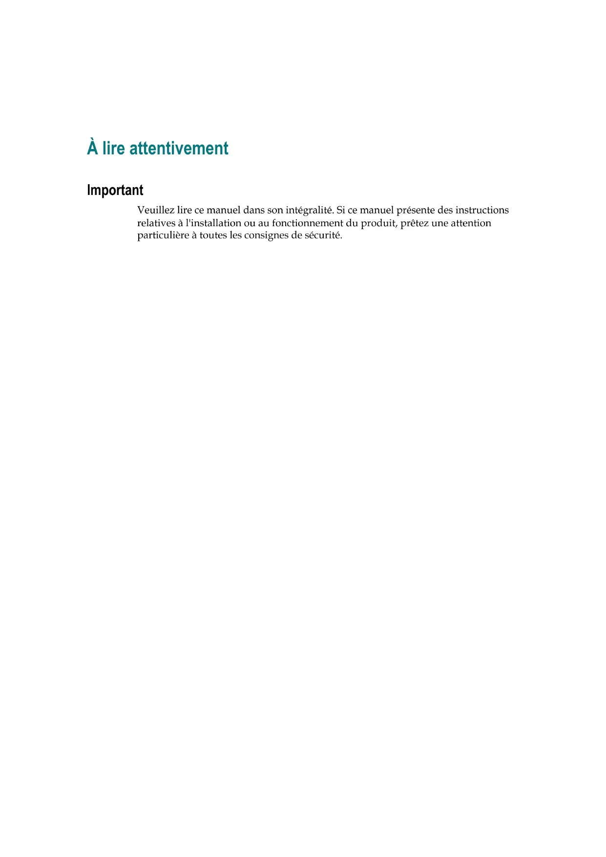 Veuillez lire ce manuel dans son intégralité. Si ce manuel présente des instructions relatives à l'installation ou au fonctionnement du produit, prêtez une attention particulière à toutes les consignes de sécurité.