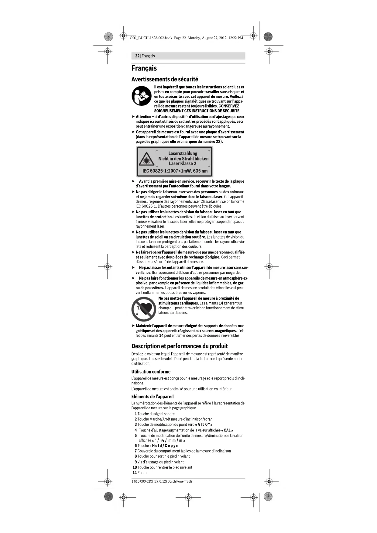 recte au soleil). Le numéro de série 23 qui se trouve sur la plaque signalétique permet une identification précise de votre appareil. OBJ_BUCH-1628-002.book Page 23 Monday, August 27, 2012 12:22 PM24 | Français 1 618 C00 62X | (27.8.12) Bosch Power Tools Lors de la première mise en service de l’inclinaison de mesure à la suite d’un changement de piles, tous les éléments de l’écran s’allument pour 1 sec et un signal acoustique se fait entendre. Tous les réglages (fonction de mesu- re, unité réglée) seront effacés lors d’un changement de pile. Remplacez la pile si le voyant d’alerte du niveau d’alimentation des piles d s’allume. Montage/remplacement des piles du laser Relevez le couvercle du compartiment à piles 20 et placez les piles. Veillez à respecter la polarité qui doit correspondre à la figure se trouvant à l’inté- rieur du couvercle du compartiment à piles. Si le laser n’est plus allumé, il faut remplacer les piles. Note : Le voyant d’alerte du niveau d’alimentation des piles d sur l’écran ne concerne pas les piles du laser. f Il est impératif d’éteindre le laser avant de remplacer les piles. Les rayons d’un laser mis en marche par inadvertance peuvent éblouir les yeux des personnes visées. Remplacez toujours toutes les piles du laser en même temps. N’utilisez que des piles de la même marque avec la même capacité. Fonctionnement Mise en service f Protégez l’appareil de mesure contre l’humidité, ne l’exposez pas directement aux rayons du soleil. f N’exposez pas l’appareil de mesure à des températures extrêmes ou de forts changements de température. Ne le stockez pas trop long- temps dans une voiture par ex. S’il est exposé à d’importants change- ments de température, laissez-le revenir à la température ambiante avant de le remettre en marche. Des températures extrêmes ou de forts changements de température peuvent réduire la précision de l’appareil de mesure. f Evitez les chocs ou les chutes de l’appareil de mesure. Si l’appareil de mesure est soumis à de fortes sollicitations extérieures, effectuez tou- jours un contrôle de précision avant de continuer à travailler (voir « Contrôle de précision et ajustage de l’appareil de mesure », page 26). f Maintenez les surfaces de l’appareil de mesure propres et protégez- les de coups et de chocs. Des particules d’encrassement ou des défor- mations pourraient conduire à des mesures erronées. Mise en place et fixation de l’appareil de mesure Afin de mesurer et de reporter des inclinaisons, vous pouvez poser l’appa- reil de mesure sur une surface mais vous disposez également d’autres pos- sibilités de positionnement ou de fixation. Positionnement à l’aide du dispositif mécanique de nivellement (par ex. pour les surfaces irrégulières) (voir figure B): – Poussez brièvement contre le pied 16 pour le faire sortir. Appuyez sur la touche 8 pour faire sortir le pied nivelant 17. Ajustez le pied nivelant en tournant la vis d’ajustage 9 en hauteur de sorte à ce que le faisceau longe la surface à mesurer ou que l’inclinaison souhaitée s’affiche comme va- leur mesurée b. – Pour les travaux sans mécanique de nivellement, faites rentrer pied 16 et pied nivelant 17. Poussez à cet effet les deux parties du pied l’une con- tre l’autre () puis introduisez le pied 16 dans l’appareil de mesure () jusqu’à ce qu’il s’encliquette de façon perceptible. Pour faire rentrer le pied nivelant 17, poussez l’interrupteur 10 vers le côté. Montage sur le trépied : – Placez l’appareil de mesure avec le raccord de trépied 1/4" 18 sur la pla- que de changement rapide du trépied 26 ou le trépied d’un appareil pho- to disponible dans le commerce. Serrez l’appareil de mesure au moyen de la vis de blocage de la plaque de changement rapide. OBJ_BUCH-1628-002.book Page 24 Monday, August 27, 2012 12:22 PMFrançais | 25 Bosch Power Tools 1 618 C00 62X | (27.8.12) Fixation par aimants : – Placez l’appareil de mesure avec les aimants 14 sur un élément suffisam- ment magnétique. f Vérifiez si l’appareil de mesure est bien fixé. Un appareil de mesure mal fixé peut tomber et vous blesser ou blesser d’autres personnes. Une chute peut endommager l’appareil de mesure ou causer des endomma- gements. Fixation avec des sangles (voir figure C): – Faites passer les sangles 25 à travers les guides de la sangle 15 et fixez l’appareil de mesure à l’aide des deux sangles sur des tuyaux ou similaire. Veillez à ce que la fixation auto-grippante de la sangle soit bien appliquée sur la sangle. Pour les tuyaux fins, faites passer la sangle, le côté lisse vers l’extérieur, à travers les guides de la sangle et, conformément aux indications sur la figure, faites-la passer autour de l’appareil de mesure ; pour les tuyaux épais, faites passer la sangle, le côté lisse vers l’intérieur, à travers les guides de sangle. f Bloquez l’appareil de mesure toujours avec les deux sangles et véri- fiez si les sangles sont bien fixés. La force de maintien des sangles 25 dépend du matériau sur lequel elles sont fixées. Un appareil de mesure qui n’est pas fermement fixé peut tomber et être endommagé ou causer des dommages. f Ne laissez pas les enfants utiliser les sangles 25 sans surveillance. Ils peuvent se blesser avec les sangles. Mise en marche/hors fonctionnement de la mesure d’inclinaison et de l’écran Pour mettre en marche la mesure d’inclinaison et l’écran, appuyez sur la touche Marche/Arrêt 2. L’appareil de mesure se trouve en mode de mesure d’inclinaison avec point zéro standard. Pour mettre hors fonctionnement la mesure d’inclinaison et l’écran, ap- puyez à nouveau sur la touche Marche/Arrêt 2. Si l’on n’appuie sur aucune touche sur l’appareil de mesure pendant 30 min. environ et que l’inclinaison de l’appareil de mesure n’est pas modifiée de plus de 1
