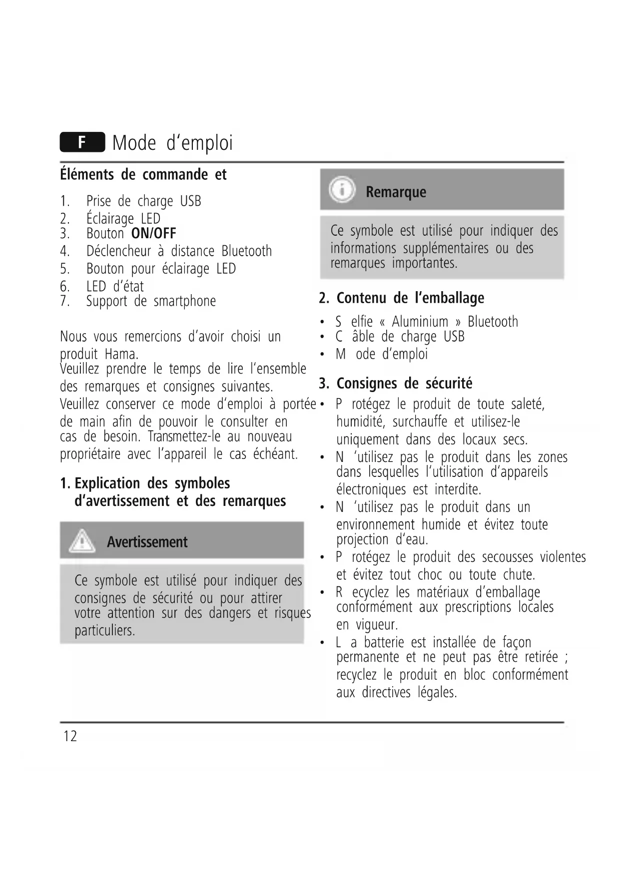 - La batterie est installée de façon permanente et ne peut pas être retirée ; recyclez le produit en bloc conformément aux directives légales. F Mode d‘emploi13
