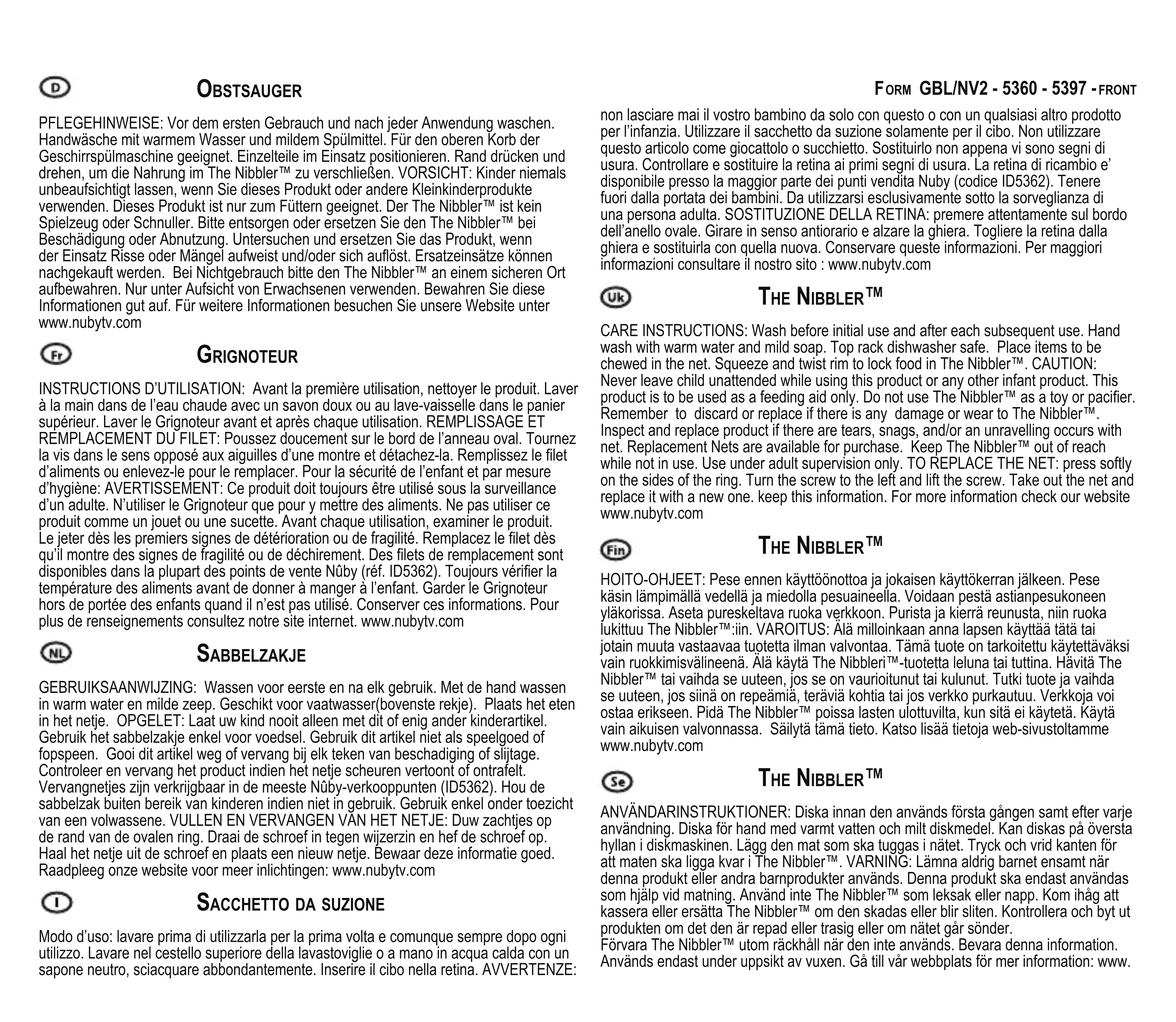 INSTRUCTIONS D'UTILISATION: Avant la première utilisation, nettoyer le produit. Laver à la main dans de l'eau chaude avec un savon doux ou au lave-vaisselle dans le panier supérieur. Laver le Grignoteur avant et après chaque utilisation. REMPLISSAGE ET REMPLACEMENT DU FILET: Poussez doucoement sur le bord de l'anneau oval. Tourmez la vis dans le sens oppose aux aiguilles d'une montre et détachez-la. Remplisseze le filt d'aliments ou enlevez-le pour le replacer. Pour la sécurité de l'enfant et par mesure d'hygiene: AVERTISSEMENT: Ce produit doit toujours être utilisé sous la surveillance d'un adulte. N'utiliser le Grignoteur que pour ymettre des alimentes. Ne pas utiliser ce produit comme un jouet ou une sucette. Avant chaque utilisation, examiner le produit. Le jeter des les premiers signes de déterioration ou de fragilité. Remplaceze le filt dess qu'il montre des signes de fragilité ou de déchirement. Des fillets de remplacement sont disponibles dans la plupart des points de vente Nuby (réf. ID5362). Toujours vérifier la température des alimentes avant de donner à manger à l'enfant. Garder le Grignoteur hors de portée des enfants quand il n'est pas utilisé. Conserver ces informations. Pour plus de renseignements consultez notre site internet. www.nubytv.com
