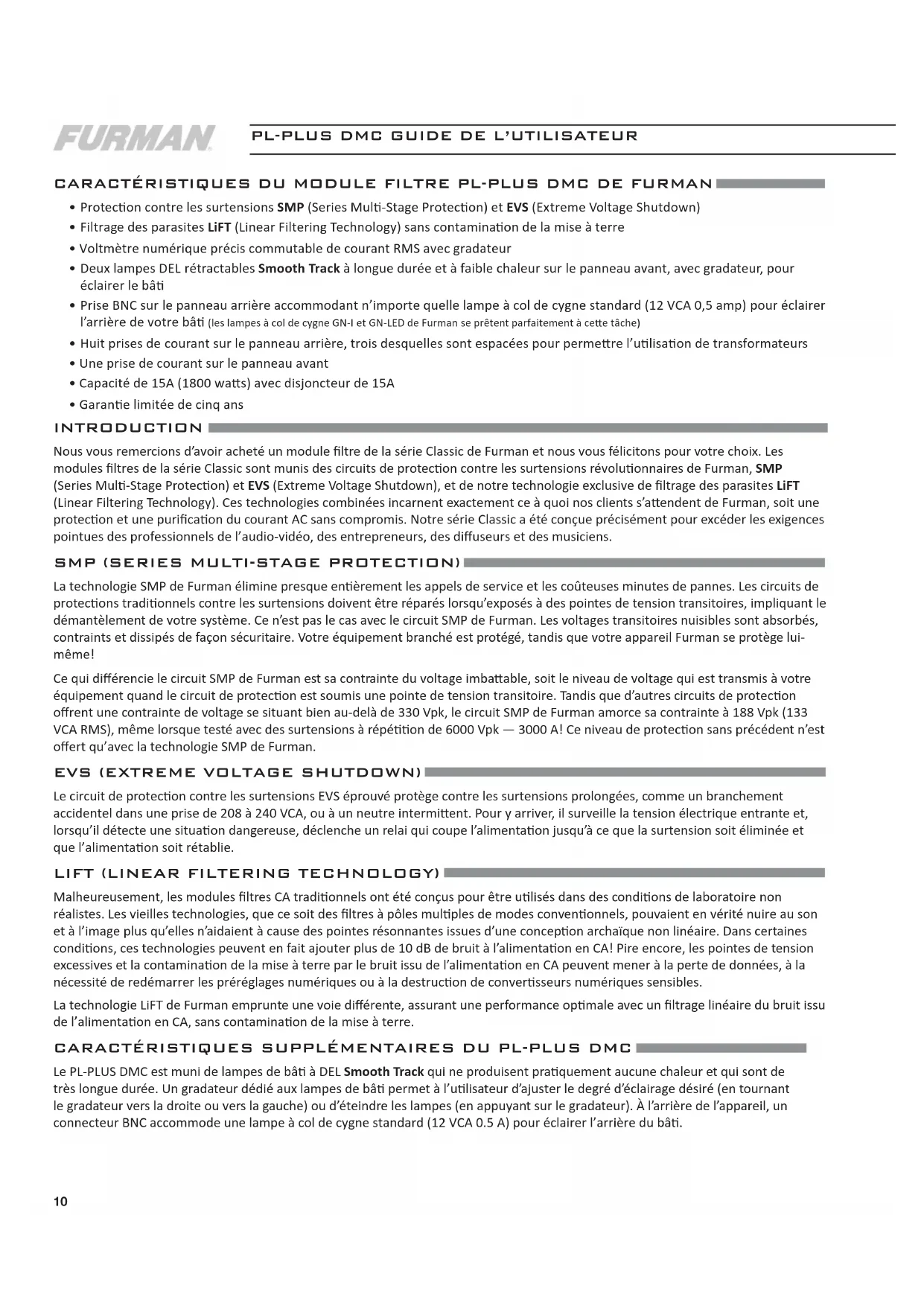 - Garane limitée de cinq ans INTRODUCTION Nous vous remercions d’avoir acheté un module ltre de la série Classic de Furman et nous vous félicitons pour votre choix. Les modules ltres de la série Classic sont munis des circuits de protecon contre les surtensions révoluonnaires de Furman, SMP (Series Mul-Stage Protecon) et EVS (Extreme Voltage Shutdown), et de notre technologie exclusive de ltrage des parasites LiFT (Linear Filtering Technology). Ces technologies combinées incarnent exactement ce à quoi nos clients s’aendent de Furman, soit une protecon et une puricaon du courant AC sans compromis. Notre série Classic a été conçue précisément pour excéder les exigences pointues des professionnels de l’audio-vidéo, des entrepreneurs, des diuseurs et des musiciens. SMP (SERIES MULTI-STAGE PROTECTION) La technologie SMP de Furman élimine presque enèrement les appels de service et les coûteuses minutes de pannes. Les circuits de protecons tradionnels contre les surtensions doivent être réparés lorsqu’exposés à des pointes de tension transitoires, impliquant le démantèlement de votre système. Ce n’est pas le cas avec le circuit SMP de Furman. Les voltages transitoires nuisibles sont absorbés, contraints et dissipés de façon sécuritaire. Votre équipement branché est protégé, tandis que votre appareil Furman se protège lui- même! Ce qui diérencie le circuit SMP de Furman est sa contrainte du voltage imbaable, soit le niveau de voltage qui est transmis à votre équipement quand le circuit de protecon est soumis une pointe de tension transitoire. Tandis que d’autres circuits de protecon orent une contrainte de voltage se situant bien au-delà de 330 Vpk, le circuit SMP de Furman amorce sa contrainte à 188 Vpk (133 VCA RMS), même lorsque testé avec des surtensions à répéon de 6000 Vpk — 3000 A! Ce niveau de protecon sans précédent n’est oert qu’avec la technologie SMP de Furman. EVS (EXTREME VOLTAGE SHUTDOWN) Le circuit de protecon contre les surtensions EVS éprouvé protège contre les surtensions prolongées, comme un branchement accidentel dans une prise de 208 à 240 VCA, ou à un neutre intermient. Pour y arriver, il surveille la tension électrique entrante et, lorsqu’il détecte une situaon dangereuse, déclenche un relai qui coupe l’alimentaon jusqu’à ce que la surtension soit éliminée et que l’alimentaon soit rétablie. LIFT (LINEAR FILTERING TECHNOLOGY) Malheureusement, les modules ltres CA tradionnels ont été conçus pour être ulisés dans des condions de laboratoire non réalistes. Les vieilles technologies, que ce soit des ltres à pôles mulples de modes convenonnels, pouvaient en vérité nuire au son et à l’image plus qu’elles n’aidaient à cause des pointes résonnantes issues d’une concepon archaïque non linéaire. Dans certaines condions, ces technologies peuvent en fait ajouter plus de 10 dB de bruit à l’alimentaon en CA! Pire encore, les pointes de tension excessives et la contaminaon de la mise à terre par le bruit issu de l’alimentaon en CA peuvent mener à la perte de données, à la nécessité de redémarrer les préréglages numériques ou à la destrucon de conversseurs numériques sensibles. La technologie LiFT de Furman emprunte une voie diérente, assurant une performance opmale avec un ltrage linéaire du bruit issu de l’alimentaon en CA, sans contaminaon de la mise à terre. CARACTÉRISTIQUES SUPPLÉMENTAIRES DU PL-PLUS DMC Le PL-PLUS DMC est muni de lampes de bâ à DEL Smooth Track qui ne produisent praquement aucune chaleur et qui sont de très longue durée. Un gradateur dédié aux lampes de bâ permet à l’ulisateur d’ajuster le degré d’éclairage désiré (en tournant le gradateur vers la droite ou vers la gauche) ou d’éteindre les lampes (en appuyant sur le gradateur). À l’arrière de l’appareil, un connecteur BNC accommode une lampe à col de cygne standard (12 VCA 0.5 A) pour éclairer l’arrière du bâ.11 FRANÇAIS ENGLISH ESPAÑOL Le PL-PLUS DMC est muni d’une prise de courant ulitaire sur le panneau avant et de huit prises de courant sur le panneau arrière en deux blocs isolés. Les prises du bloc A sont espacées pour permere l’ulisaon de transformateurs. Puisque les blocs sont isolés l’un de l’autre, il est recommandé que l’on branche l’équipement analogique dans le bloc A et l’équipement numérique dans le bloc B (ou vice versa). La charge de 15 ampères (1800 was) du PL-PLUS DMC est alimentée par un l robuste de 10 pieds 14 AWG. De plus, le PL-PLUS DMC est muni d’un voltmètre numérique précis commutable achant le niveau de tension entrant en étapes de 1 volt ou le véritable courant RMS en étapes de 0,1 A. La précision du voltmètre est de ±1,5 volts, tandis qu’il est muni d’un indicateur de niveau de tension tricolore. Il permet à l’ulisateur de savoir si le niveau de tension se situe ou non dans une gamme sûre, même à parr d’une distance ne permeant pas de lire avec précision la tension achée.