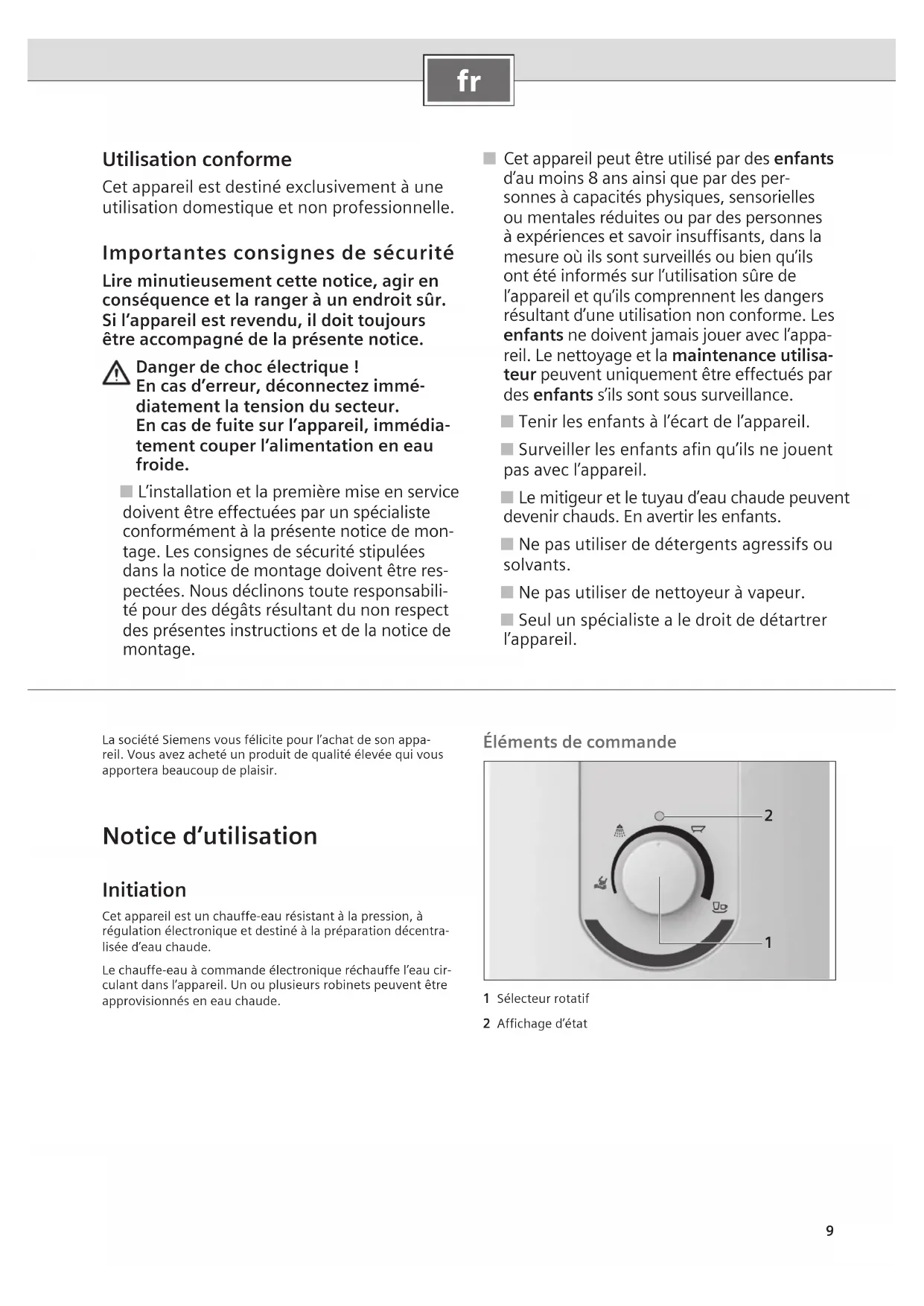 Utilisation conforme Cet appareil est destiné exclusivement à une utilisation domestique et non professionnelle. Importantes consignes de sécurité Lire minutieusement cette notice, agir en conséquence et la ranger à un endroit sûr. Si l’appareil est revendu, il doit toujours être accompagné de la présente notice. Danger de choc électrique ! En cas d’erreur, déconnectez immé- diatement la tension du secteur. En cas de fuite sur l’appareil, immédia- tement couper l’alimentation en eau froide. ■ L’installation et la première mise en service doivent être effectuées par un spécialiste conformément à la présente notice de mon- tage. Les consignes de sécurité stipulées dans la notice de montage doivent être res- pectées. Nous déclinons toute responsabili- té pour des dégâts résultant du non respect des présentes instructions et de la notice de montage. ■ Cet appareil peut être utilisé par des enfants d’au moins 8 ans ainsi que par des per- sonnes à capacités physiques, sensorielles ou mentales réduites ou par des personnes à expériences et savoir insuffisants, dans la mesure où ils sont surveillés ou bien qu’ils ont été informés sur l’utilisation sûre de l’appareil et qu’ils comprennent les dangers résultant d’une utilisation non conforme. Les enfants ne doivent jamais jouer avec l’appa- reil. Le nettoyage et la maintenance utilisa- teur peuvent uniquement être effectués par des enfants s’ils sont sous surveillance. ■ Tenir les enfants à l’écart de l’appareil. ■ Surveiller les enfants afin qu’ils ne jouent pas avec l’appareil. ■ Le mitigeur et le tuyau d’eau chaude peuvent devenir chauds. En avertir les enfants. ■ Ne pas utiliser de détergents agressifs ou solvants. ■ Ne pas utiliser de nettoyeur à vapeur. ■ Seul un spécialiste a le droit de détartrer l’appareil. La société Siemens vous félicite pour l’achat de son appa-reil. Vous avez acheté un produit de qualité élevée qui vous apportera beaucoup de plaisir. Notice d’utilisation Initiation Cet appareil est un chauffe-eau résistant à la pression, à régulation électronique et destiné à la préparation décentra-lisée d’eau chaude.Le chauffe-eau à commande électronique réchauffe l’eau cir-culant dans l’appareil. Un ou plusieurs robinets peuvent être approvisionnés en eau chaude. Éléments de commande
