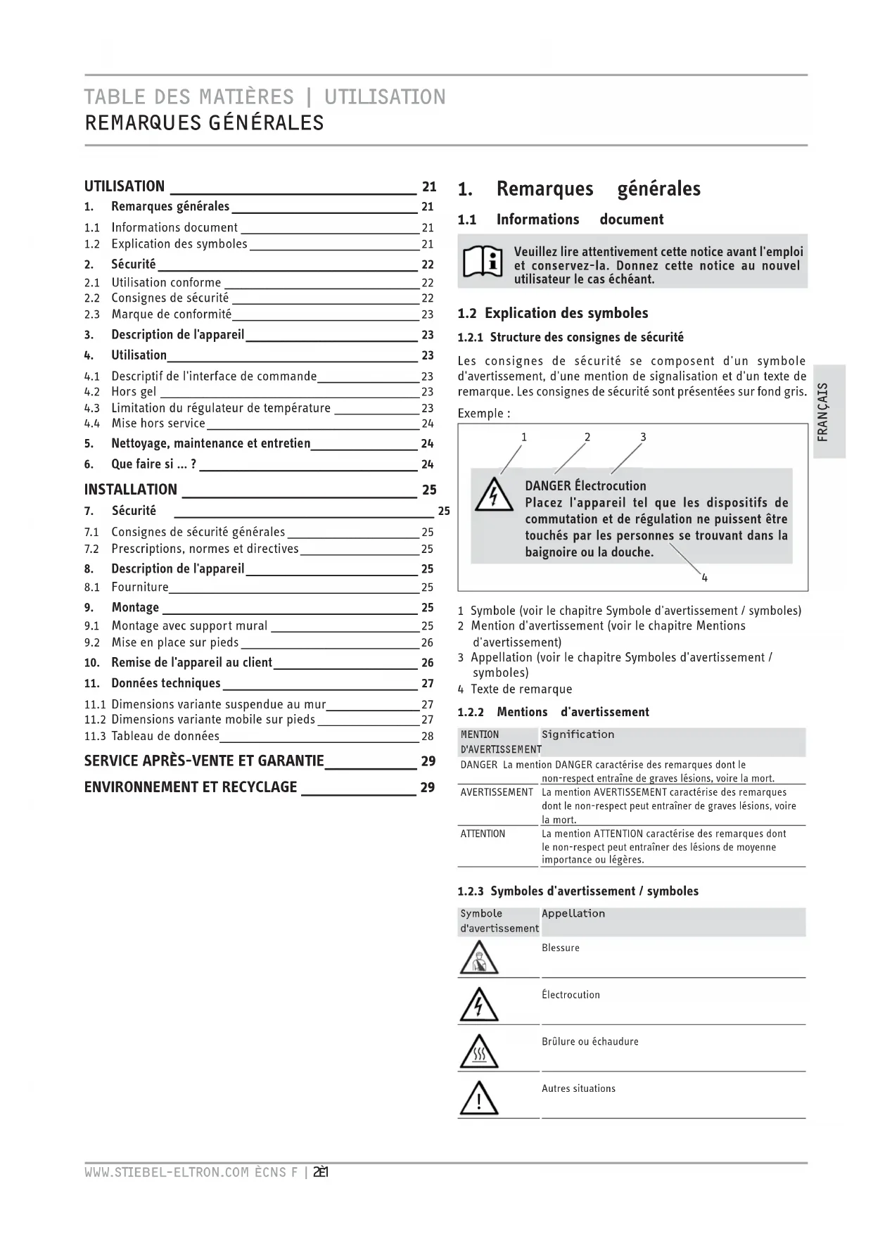 1.2.1 Structure des consignes de sécuritéLes consignes de sécurité se composent d'un symbole d'avertissement, d'une mention de signalisation et d'un texte de remarque. Les consignes de sécurité sont présentées sur fond gris.Exemple : DANGER ÉlectrocutionPlacez l'appareil tel que les dispositifs de commutation et de régulation ne puissent être touchés par les personnes se trouvant dans la baignoire ou la douche.