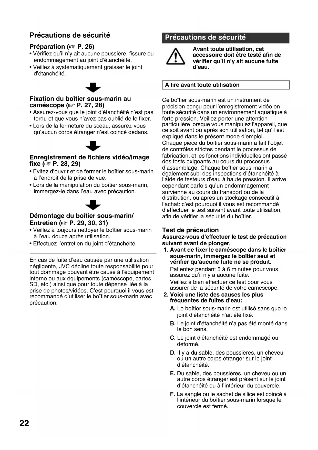 - Effectuez l’entretien du joint d’étanchéité. En cas de fuite d’eau causée par une utilisation négligente, JVC décline toute responsabilité pour tout dommage pouvant être causé à l’équipement interne ou aux équipements (caméscope, cartes SD, etc.) ainsi que pour toute dépense liée à la prise de photos/vidéos. C’est pourquoi il vous est recommandé d’utiliser le boîtier sous-marin avec précaution. Avant toute utilisation, cet accessoire doit être testé afin de vérifier qu’il n’y ait aucune fuite d’eau. Ce boîtier sous-marin est un instrument de précision conçu pour l’enregistrement vidéo en toute sécurité dans un environnement aquatique à forte pression. Veillez porter une attention particulière lorsque vous manipulez l’appareil, que ce soit avant ou après son utilisation, tel qu’il est expliqué dans le présent mode d’emploi. Chaque pièce du boîtier sous-marin a fait l’objet de contrôles strictes pendant le processus de fabrication, et les fonctions individuelles ont passé des tests exigeants au cours du processus d’assemblage. Chaque boîtier sous-marin a également subi des inspections d’étanchéité à l’aide de testeurs d’eau à haute pression. Il arrive cependant parfois qu’un endommagement survienne au cours du transport ou de la distribution, ou après un stockage consécutif à l’achat: c’est pourquoi il vous est recommandé d’effectuer le test suivant avant toute utilisation, afin de vérifier la sécurité du boîtier. Test de précaution Assurez-vous d’effectuer le test de précaution suivant avant de plonger.