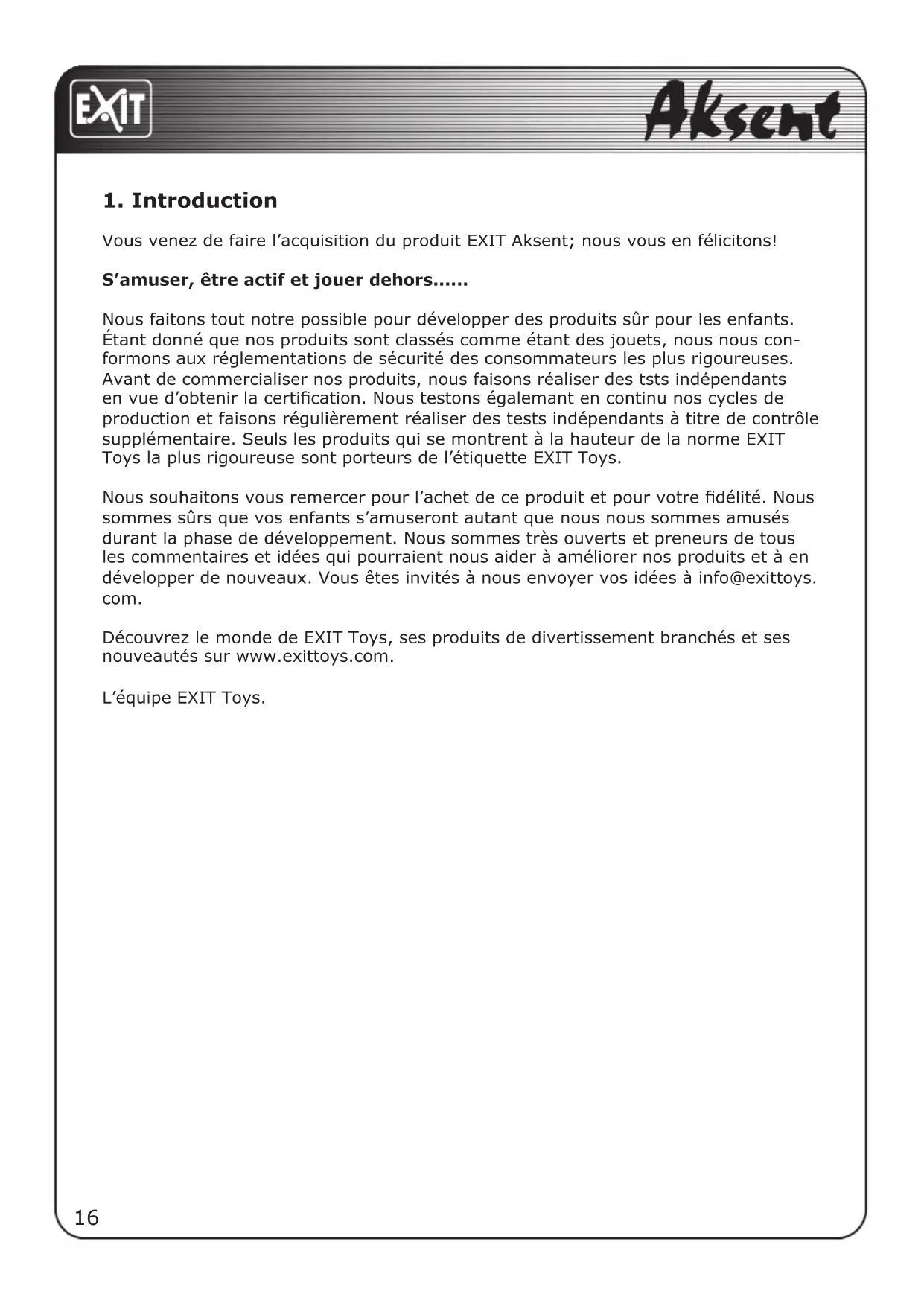 Nous souhaitons vous remercier pour l'achet de ce produit et pour votre fidélité. Nous sommes surs que vos enfants s'amuseront autant que nous nous sommesamusés durant la phase de développement. Nous sommes très ouverts et preneurs de tous les commentaires et idées qui pouraient nous aider à améliorer nos produits et à en développper de nouveaux. Vous étes invites à nous envoyer vos idées à info@exittoys. com.