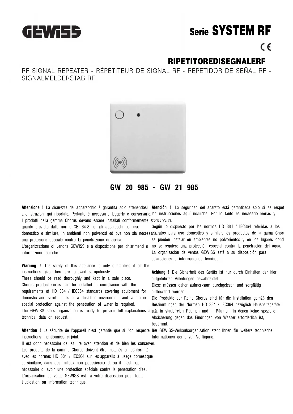 GW21985 - Répéteur de signal RF Gewiss - Notice d'utilisation et mode d'emploi gratuit