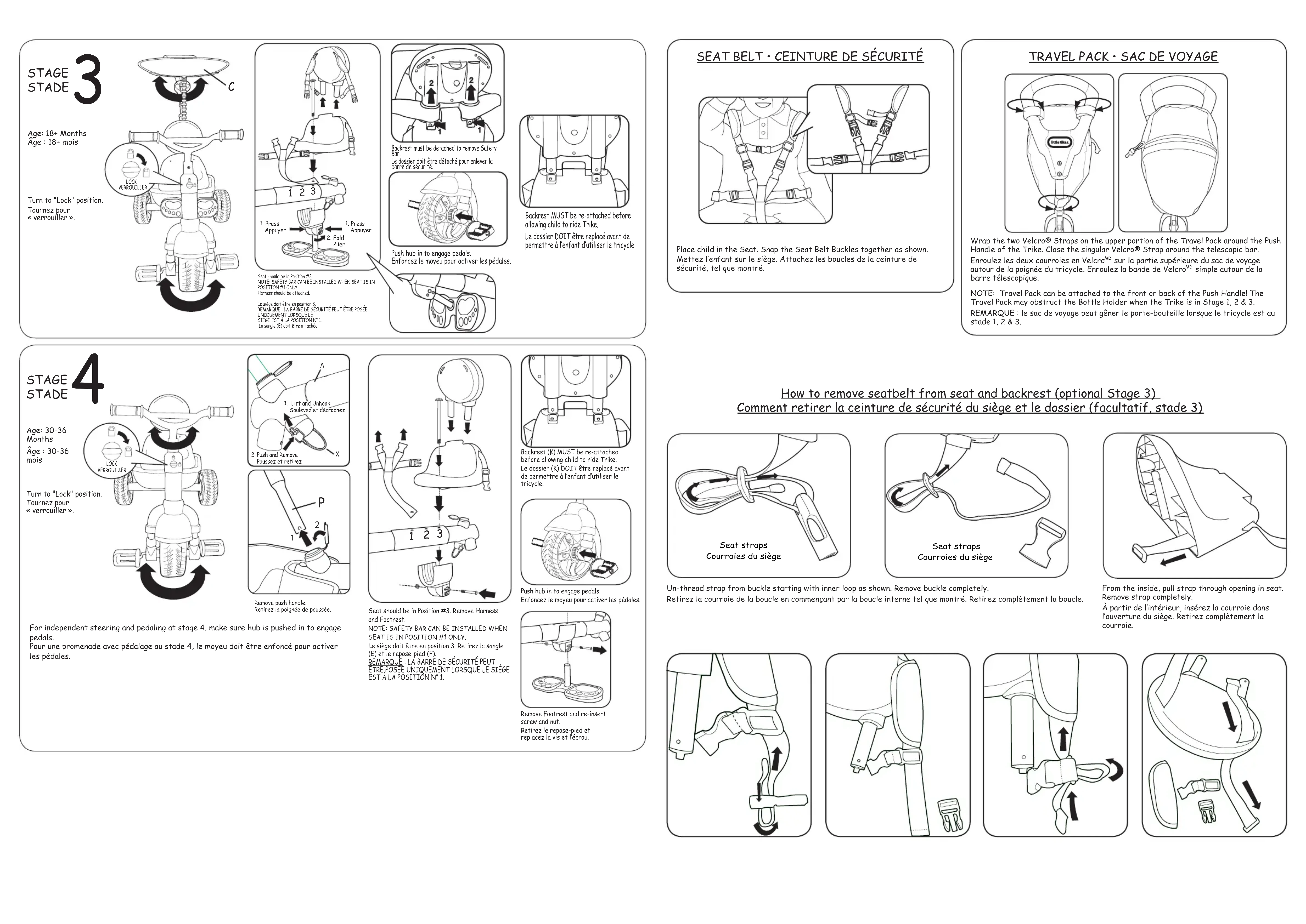 Wrap the two Velcro® Straps on the upper portion of the Travel Pack around the Push Handle of the Trike. Close the singular Velcro® Strip around the telescopic bar. Encoulez les deux courvées en Velcro® sur la partie supérieure du sac de voyage autour de la poignée du tricycle. Encoulez la bande de Velcro® simple autour de la barre téléscopique.