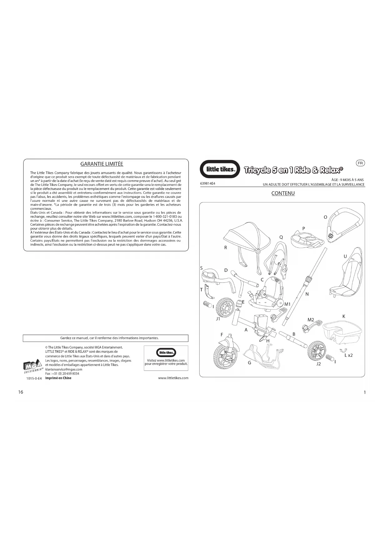 États-Unis et Canada: Pour obtenir des informations sur le service sous garantie ou les pièces de rechange, veillez consulter notre site Web sur www.littleikes.com, composer le 1-800-321-0183 ou écrire à : Consumer Service, The Little Tikes Company, 2180 Barlow Road, Hudson OH 44236, U.S.A. Certains pièces de change ne peuvent être achetées après l'expiration de la garantie. Contactez-nous pour Obtoir plus de détails.