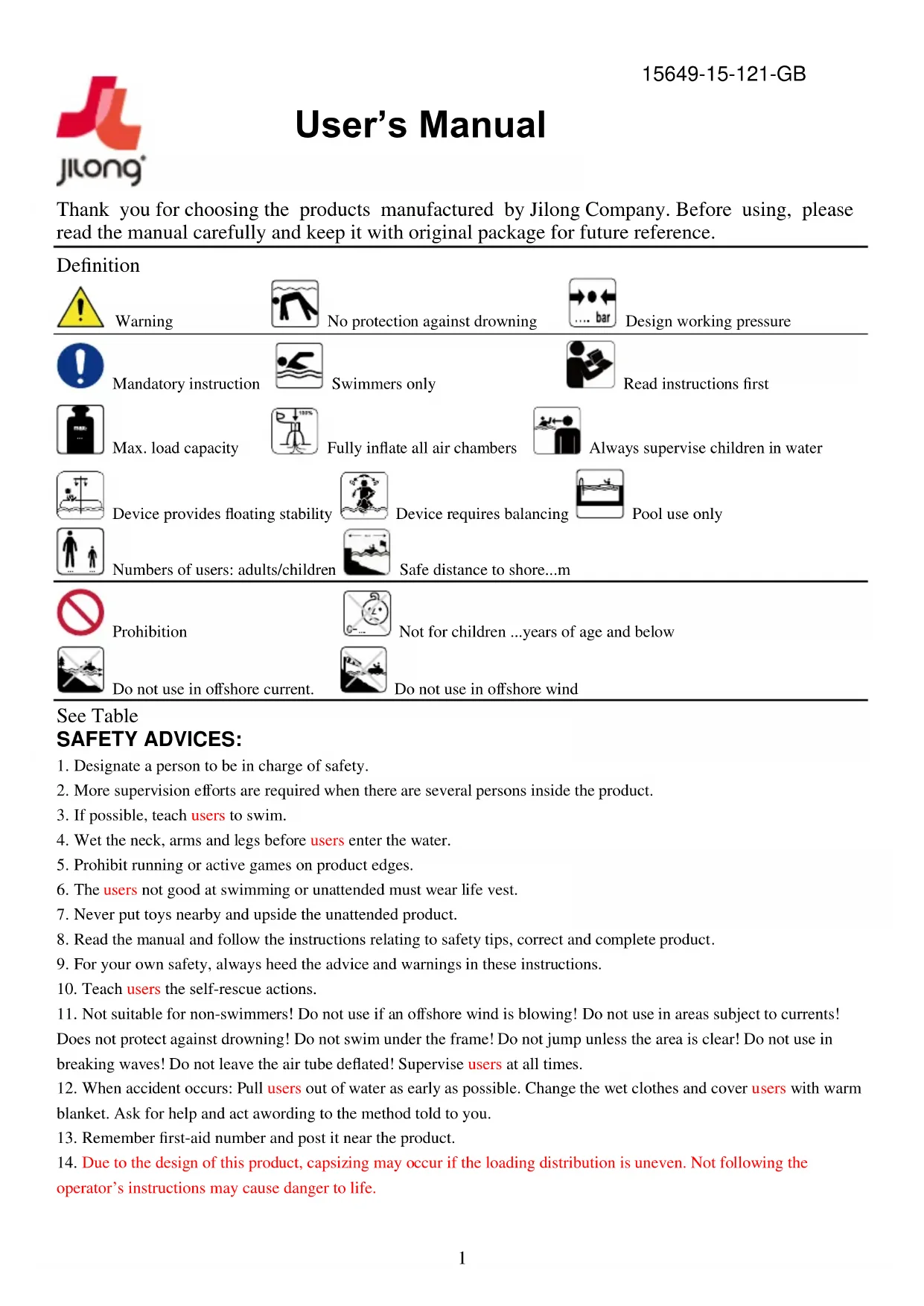 Repair Patch Instructions (Small pinhole and small puncture leaks can be repaired with the included repair patch) a) Locate the leak place. b) Deflate the air. c) Clean the area surrounding the leakage and wipe up all water from the surface. d) Take out the repair patch, cut it into required shape and size, which should be litter larger than the leaking area, put the patch on leaking area and press firmly. e) You can use it again after 30 minutes drying of the repaired position. If the damage is bigger than 1” (2.5cm), we recommend using a Silicone or rubber based glue for repair. Please read warning statement on glue prior to use. Shanghai Jilong Plastic Products Co. Ltd. No. 460 Lanxue Road, Huanglou, Pudong Area, Shanghai, 201205, P.R. China Tel: +86-21-58942200 E-mail: info@jilong.com Web: www.jilong.com3 Merci d'avoir choisi parmi les produits fabriqués par Jilong Company. Avant utilisation, veuillez lire le manuel attentivement et le conserver avec l'emballage d'origine pour référence future. Définition AVERTISSEMENT Ne protège pas de la noyade Pression théorique de fonctionnement OBLIGATION Réservé aux nageurs Lire les instructions avant utilisation Charge maximale Gonfler totalement toutes les chambres à air Surveiller toujours les enfants dans l'eau Usage en piscine uniquement L'article fournit une stabilité de flottaison L'article nécessite une recherche d'équilibre Nombre d'utilisateurs: adultes/enfants Distance de sécurité par rapport au rivage...m INTERDICTION Interdit aux enfants de moins de ... ans Ne pas utiliser dans les zones de courants Ne pas utiliser en cas de vent de terre Voir Tableau INSTRUCTIONS RELATIVES À LA SÉCURITÉ: