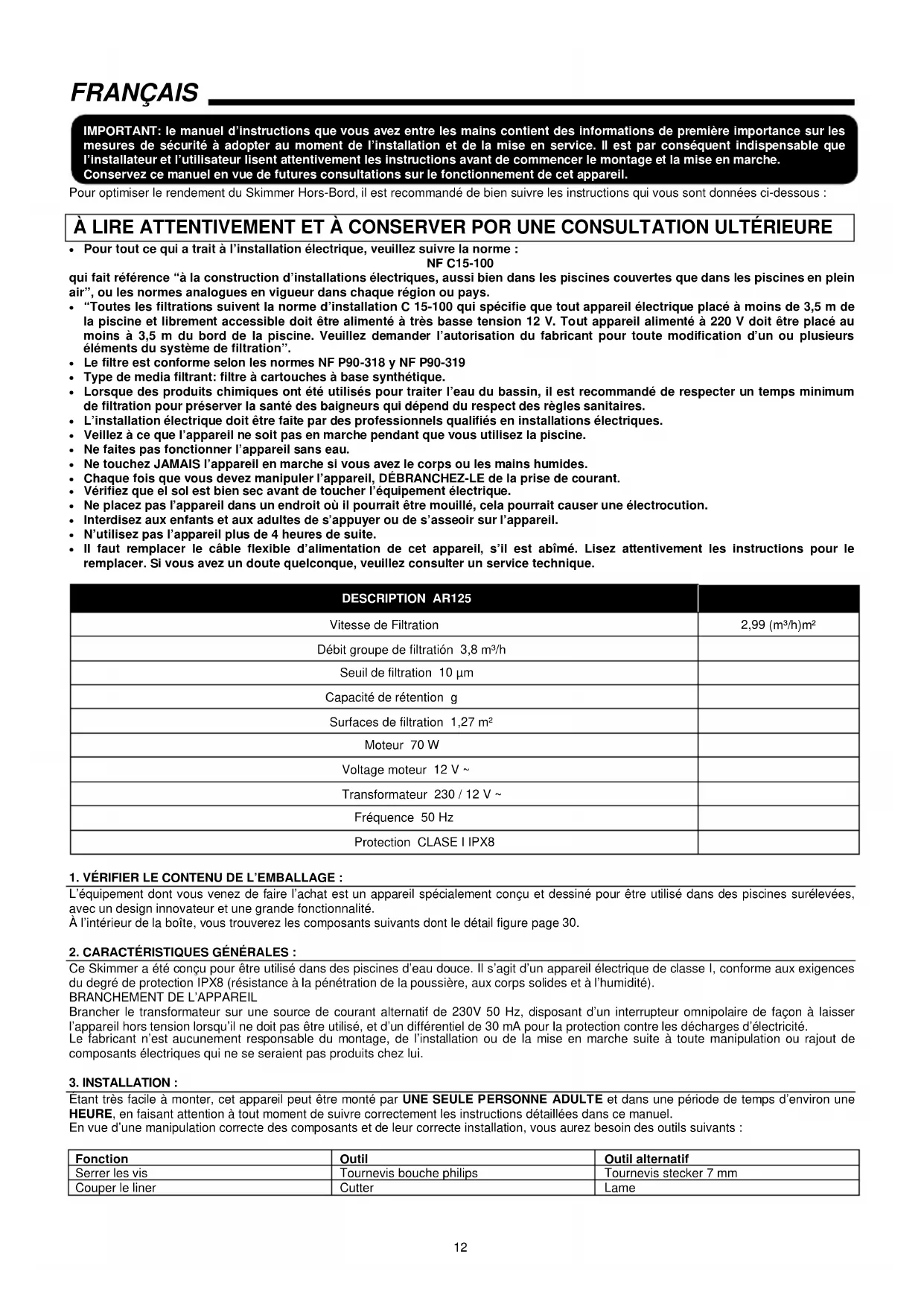 Toutes les filtrations suivent la norme d’installation C 15-100 qui spécifie que tout appareil électrique placé à moins de 3,5 m de la piscine et librement accessible doit être alimenté à travers une tension de 12 V. Tout appareil alimenté à 220 V doit être placé au moins à 3,5 m du bord de la piscine. Veuillez demander l'autorisation du fabricant pour toute modification d'un ou plusieurs éléments du système de filtration. Le filtre est conforme selon les normes NF P90-318 et NF P90-319 - Type de média filtrant : filtré à cartouches à base synthétique. Lorsque des produits chimiques ont été utilisés pour traiter l'eau du bassin, il est recommandé de respecter un temps minimum de filtration pour préserver la santé des baigneurs qui dépend du respect des règles sanitaires. L'installation électrique doit être faite par des professionnels qualifiés en installations électriques. Veillez à ce que l'appareil ne soit pas en marche pendant que vous utilisez la piscine. - Ne faites pas fonctionner l'appareil sans eau. - Ne touchez JAMAIS l'appareil en marche si vous avez le corps ou les mains humides. - Chaque fois que vous devez manipuler l'appareil, DÉBRANCHÉZ-LE de la prise de courant. - Vérifiez que le sol est bien sec avant de toucher l'équipement électrique. - Ne placez pas l'appareil dans un endroit où il pourrait être mouillé, cela pourrait causer une électrocution. - Interdisez aux enfants et aux adultes de s'appuyer ou de s'asseoir sur l'appareil. - N'utilisez pas l'appareil plus de 4 heures de suite. - Il faut remplacer le câble flexible d'alimentation de cet appareil, s'il est abîmé. Lisez attentivement les instructions pour le replacer. Si vous avez un doute quelconque, veuillez consulter un service technique.
