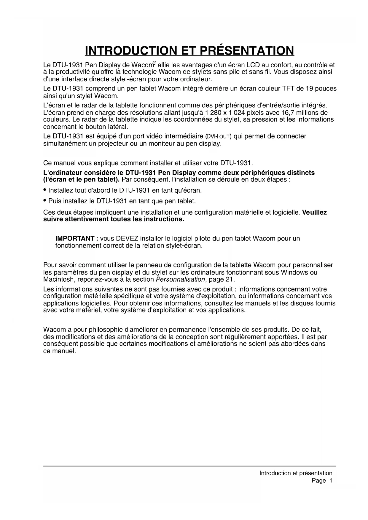 allie les avantages d'un écran LCD au confort, au contrôle et à la productivité qu'offre la technologie Wacom de stylets sans pile et sans fil. Vous disposez ainsi d'une interface directe stylet-écran pour votre ordinateur. Le DTU-1931 comprend un pen tablet Wacom intégré derrière un écran couleur TFT de 19 pouces ainsi qu'un stylet Wacom. L'écran et le radar de la tablette fonctionnent comme des périphériques d'entrée/sortie intégrés. L'écran prend en charge des résolutions allant jusqu'à 1 280 x 1 024 pixels avec 16,7 millions de couleurs. Le radar de la tablette indique les coordonnées du stylet, sa pression et les informations concernant le bouton latéral. Le DTU-1931 est équipé d'un port vidéo intermédiaire ( DVI-I OUT) qui permet de connecter simultanément un projecteur ou un moniteur au pen display. Ce manuel vous explique comment installer et utiliser votre DTU-1931. L'ordinateur considère le DTU-1931 Pen Display comme deux périphériques distincts (l'écran et le pen tablet). Par conséquent, l'installation se déroule en deux étapes :