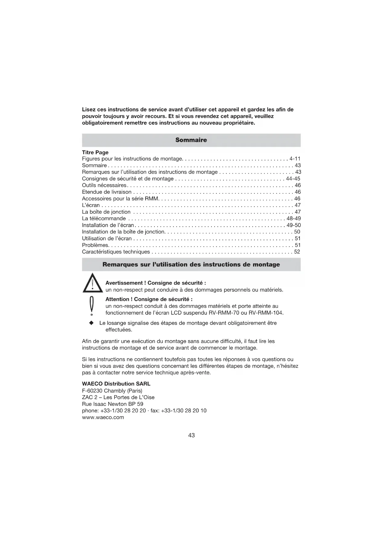 - Installation de l’écran Consignes générales de montage ! Avant de mettre l’écran en place, tenez compte des points suivants : – Positionnez l’écran provisoirement. – Le lieu de montage doit être plat. – Avant le montage final, contrôlez si la place libre disponible au-dessus du lieu de montage choisi est suffisante pour fixer des rondelles et des écrous. – N’oubliez pas de prendre en compte le poids de l’écran. Est-il nécessaire de renforcer la fixation (rondelles ou plaques plus grandes) ? – Est-il possible de poser un kit de câble de raccordement et une rallonge vers l’écran ? – Veillez à ne pas monter l’écran dans l’angle d’efficacité d’un coussin gonflable. Un déclenchement présente autrement des risques de blessures. Ne montez pas l’écran dans la zone d’impact de la tête.Installation de l’écran Testez le fonctionnement avant le montage. Si une lampe intérieure figure à un endroit approprié, par exemple entre le siège du conducteur et le siège du passager, il est possible d’installer l’écran suspendu à cet endroit. Vérifiez que la longueur du câble de raccordement suffit pour relier l’appareil entre son emplacement et la boîte de jonction. Attention ! Veillez à bien pouvoir fixer l’écran à son emplacement (voir H 1.4). L’habillage de plafond est-il suffisamment stable ? Des vis suffiront-elles pour obtenir une résistance satisfaisante (voir H 1.5)? Essayez d’ouvrir l’écran (voir H 1.5). Attention ! La lampe intérieure doit être hors tension afin d’éviter tout risque de court-circuit durant l’installation de l’écran. Enlevez la lampe intérieure (voir H 1.1). Fixez la plaque de fixation (voir H 1.2). Posez le câble de raccordement entre l’écran et l’emplacement prévu pour la boîte de jonction. Branchez le câble d’alimentation de la lampe intérieure d’origine aux connexions de l’écran (il n’est pas nécessaire de faire attention à la polarité) (voir H 1.3). Branchez le câble de raccordement dans la douille (voir H 1.6). Vous devez obligatoirement tenir compte des consignes de sécurité. Installation de la boîte de jonction L’emplacement prévu doit être protégé contre l’humidité. Vue la construction compacte de la boîte, il est recommandé de la monter sous le tableau de bord. La boîte peut être fixée au moyen des vis à tôle fournies avec la boîte ou bien avec de la bande Velcro autoadhésive (ne fait pas partie de l’étendue de livraison). Tenez compte des consignes de sécurité et de montage ! L’alimentation en courant doit être effectuée par le biais d’une source d’énergie commutée, par exemple borne 15. Même lorsque le système est hors marche (réception infrarouge active), celui-ci possède une certaine consommation de courant laquelle risque, sur une durée plus longue, de décharger la batterie du véhicule. La boîte de jonction est dotée d’entrées pour 2 sources vidéo (voir I 2). Il peut s’agir d’un lecteur DVD (WAECO, n° d’art. DVD-PL-10), d’une caméra etc. Branchez les câbles RCA des sources vidéo dans les douilles VIDEO/AUDIO (voir I 2). Un signal audio mono est créé en cas d’utilisation d’une entrée audio. 50Utilisation de l’écran Après avoir achevé tous les branchements, l’écran se met automatiquement en marche si l’alimentation en courant est appliquée (POWER DIRECT = ON) ou bien vous pouvez mettre l’appareil en marche au moyen de la télécommande (touche POWER) (voir F 1.1). Si une source vidéo est raccordée et en marche, l’image apparaît et le signal audio est transmis par le biais du casque d’écoute infrarouge, accessoire HS-10 (voir G 1), ou bien par le biais de la radio du véhicule (en cas d’utilisation du modulateur FM-MOD-10). Pour changer de canal vidéo, appuyez sur la touche AV (voir F 1.7) de la télécommande. Pour modifier la configuration, appuyez sur les touches MODE et VOL sur l’écran (voir D 1.5/1.6/1.7) ou sur la télécommande (voir F 1.5/1.4). L’écran peut être tourné de 15° sur les deux côtés et incliné de 15° vers l’avant et l’arrière (voir G 1 et G 2). Utilisation du casque d’écoute HS-10 Les écrans RV-RMM-70 et -104 sont équipés d’un émetteur infrarouge permettant l’utilisation du casque d’écoute infrarouge sans fil, HS-10 (pour plus de renseignements, se référer aux instructions). Pour l’utilisation du casque d’écoute, il faut se maintenir dans un domaine de 120° à l’horizontale et de 60° à la verticale par rapport à l’écran (voir G). Ceci permet d’assurer une réception de son parfaite. Problèmes Image instable dans le sens horizontal L’alimentation en tension est descendue sous 12 V. Chargez la batterie du véhicule. Veillez à ce que la ligne d’alimentation entre la source de tension et la boîte de jonction soit aussi courte que possible. Image instable dans le sens vertical Le format vidéo ajusté (COLOR SYSTEM) ne concorde pas avec la source vidéo. Changez de format, par exemple de NTSC à PAL. 51Caractéristiques techniques Dimensions (larg.xhaut.xprof.) : 210 x 230 x 40 mm (RV-RMM-70) Dimensions (larg.xhaut.xprof.) : 285 x 310 x 40 mm (RV-RMM-104) Tension de service : 12 V DC, 15 V maxi Consommation de courant : 16 watts maxi y inclus lampe intérieure (RV-RMM-70) 18 watts maxi y inclus lampe intérieure (RV-RMM-104) Taille de l’image : 7”, 17,7 cm en diagonale (RV-RMM-70) Taille de l’image : 10,4”, 26,4 cm en diagonale (RV-RMM-104) Nombre de pixels de l’image : 337.000 pixels (RV-RMM-70) Nombre de pixels de l’image : 480.000 pixels (RV-RMM-104) Standard vidéo : NTSC/PAL Température de service : 0 °C à +60 °C Poids : env. 1,5 kg (RV-RMM-70) Poids : env. 2,5 kg (RV-RMM-104) Sous réserve de modifications pour des perfectionnements techniques. Gardez ces instructions de service et en cas de vente, remettez les avec l’appareil à l’acheteur. Pour tous renseignements