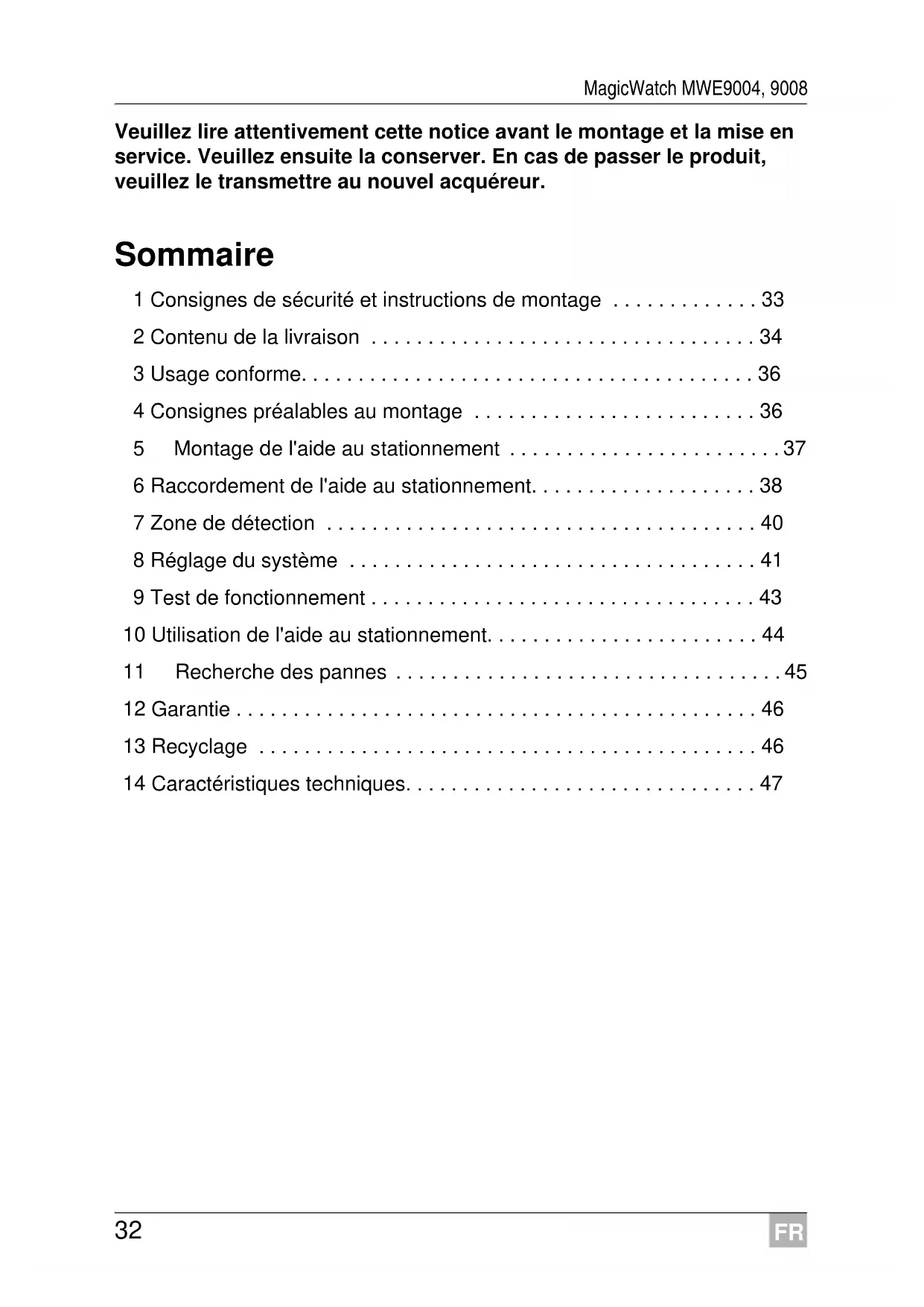 - 14 Caractéristiques techniques FR MagicWatch MWE9004, 9008 Consignes de sécurité et instructions de montage p. 47