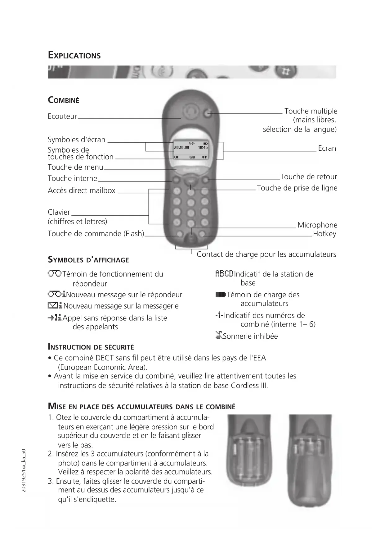 NOTIZEN20319251xx_ka_a0 COMBINÉ Ecouteur Ecran Touche de retour Microphone Contact de charge pour les accumulateurs Touche de prise de ligne Touche de menu Clavier (chiffres et lettres) Symboles d'écran Hotkey Touche interne Touche de commande (Flash) ABCD Indicatif de la station de base a Témoin de charge des accumulateurs 1 Indicatif des numéros de combiné (interne 1– 6) u Sonnerie inhibée Touche multiple (mains libres, sélection de la langue) Symboles de touches de fonction Accès direct mailbox EXPLICATIONS SYMBOLES D'AFFICHAGE t Témoin de fonctionnement du répondeur ti Nouveau message sur le répondeur i Nouveau message sur la messagerie p Appel sans réponse dans la liste des appelants