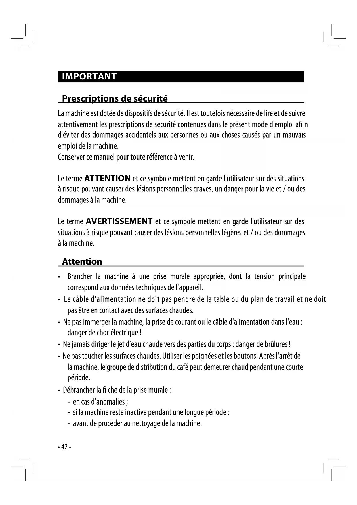 - Ne pas toucher les surfaces chaudes. Utiliser les poignées et les boutons. Après l'arrêt de la machine, le groupe de distribution du café peut demeurer chaud pendant une courte période.