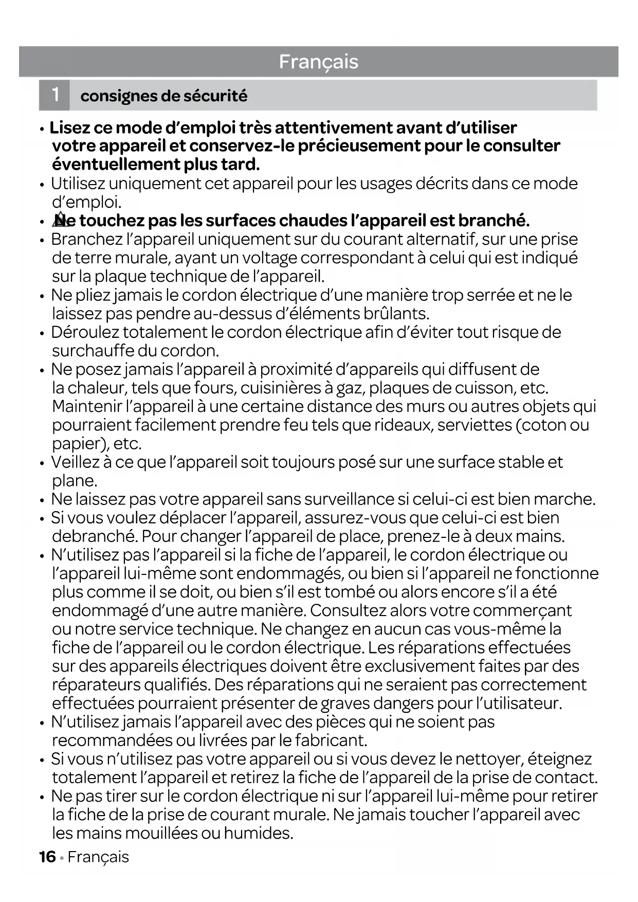 - Me touchez pas les surfaces chaudes l'appareil est branché.