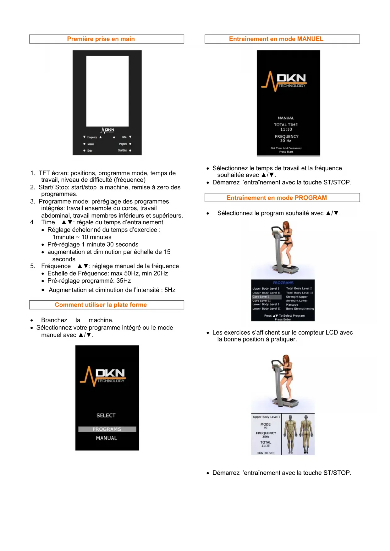 - TFT écran: positions, programme mode, temps de travail, niveau de difficulté (fréquence)