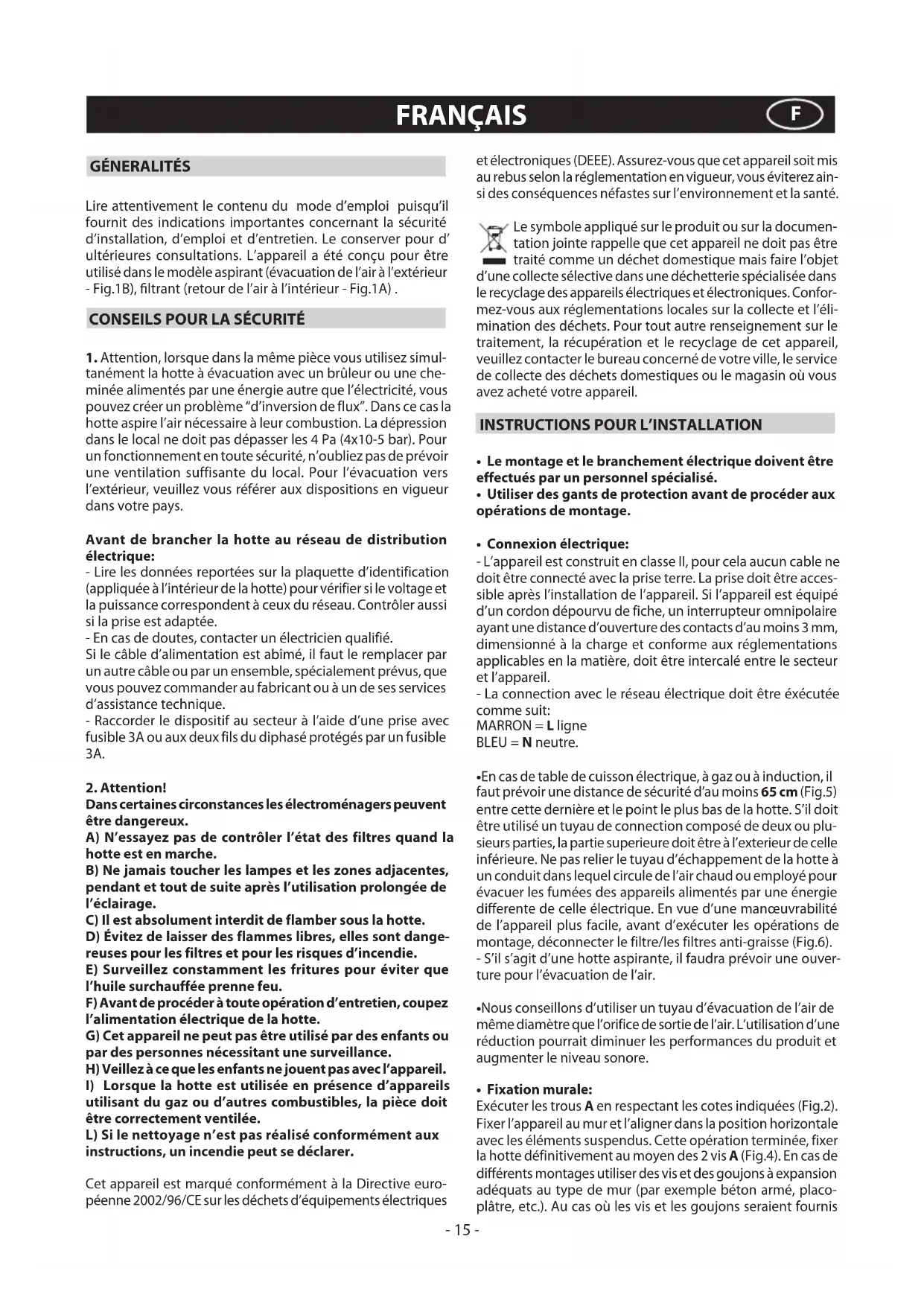 Lire attentivement le contenu du mode d’emploi puisqu’il fournit des indications importantes concernant la sécurité d’installation, d’emploi et d’entretien. Le conserver pour d’ ultérieures consultations. L’appareil a été conçu pour être utilisé dans le modèle aspirant (évacuation de l’air à l’extérieur - Fig.1B), ltrant (retour de l’air à l’intérieur - Fig.1A) .