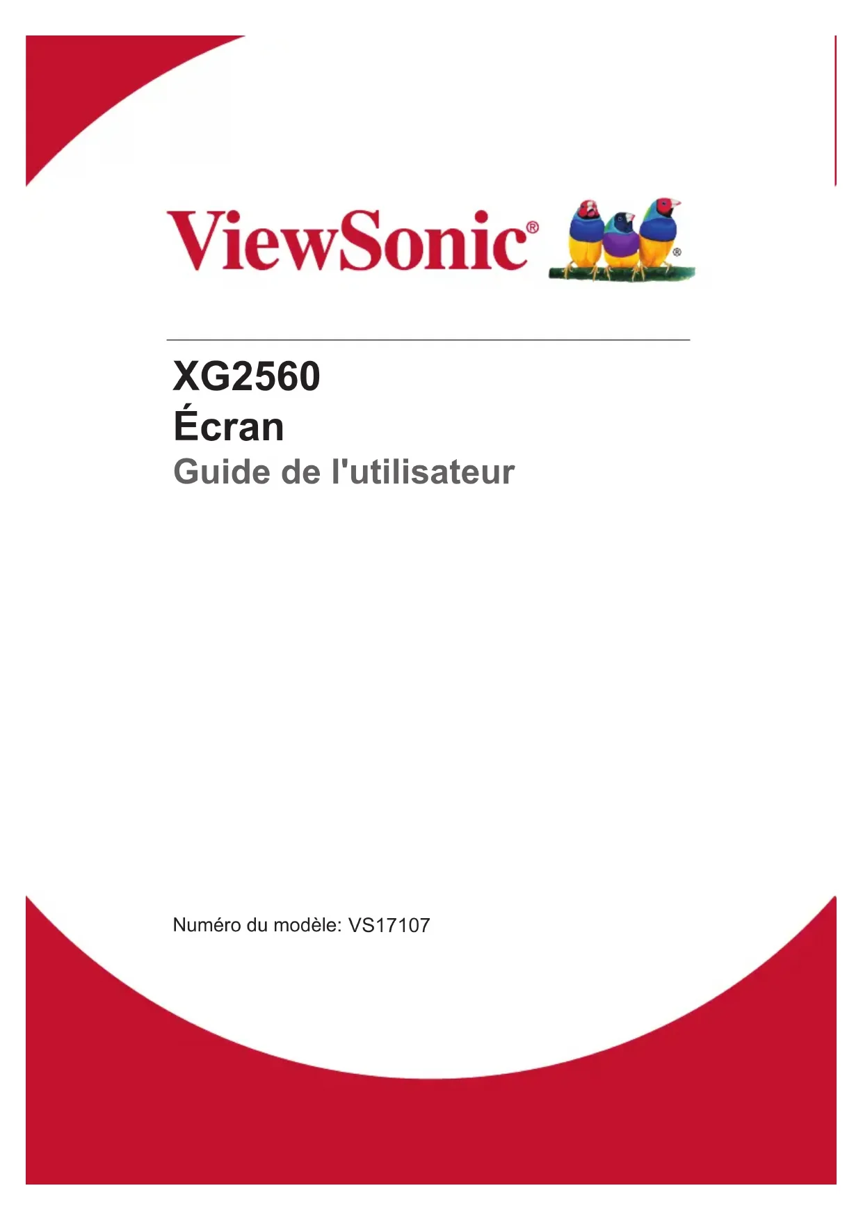 XG2560 Écran Guide de l'utilisateur Numéro du modèle: VS17107Merci d’avoir choisi ViewSonic Avec plus de 30 années d’expérience en tant que fournisseur mondial majeur en solutions visuelles, ViewSonic se consacre à dépasser les attentes du monde pour les évolutions technologiques, l’innovation et la simplicité. Chez ViewSonic, nous croyons que nos produits ont le potentiel d’avoir un impact positif sur le monde, et sommes confiants que le produit ViewSonic que vous avez choisi vous sera utile. Encore une fois, merci d’avoir choisi ViewSonic !iii Table des Matičres