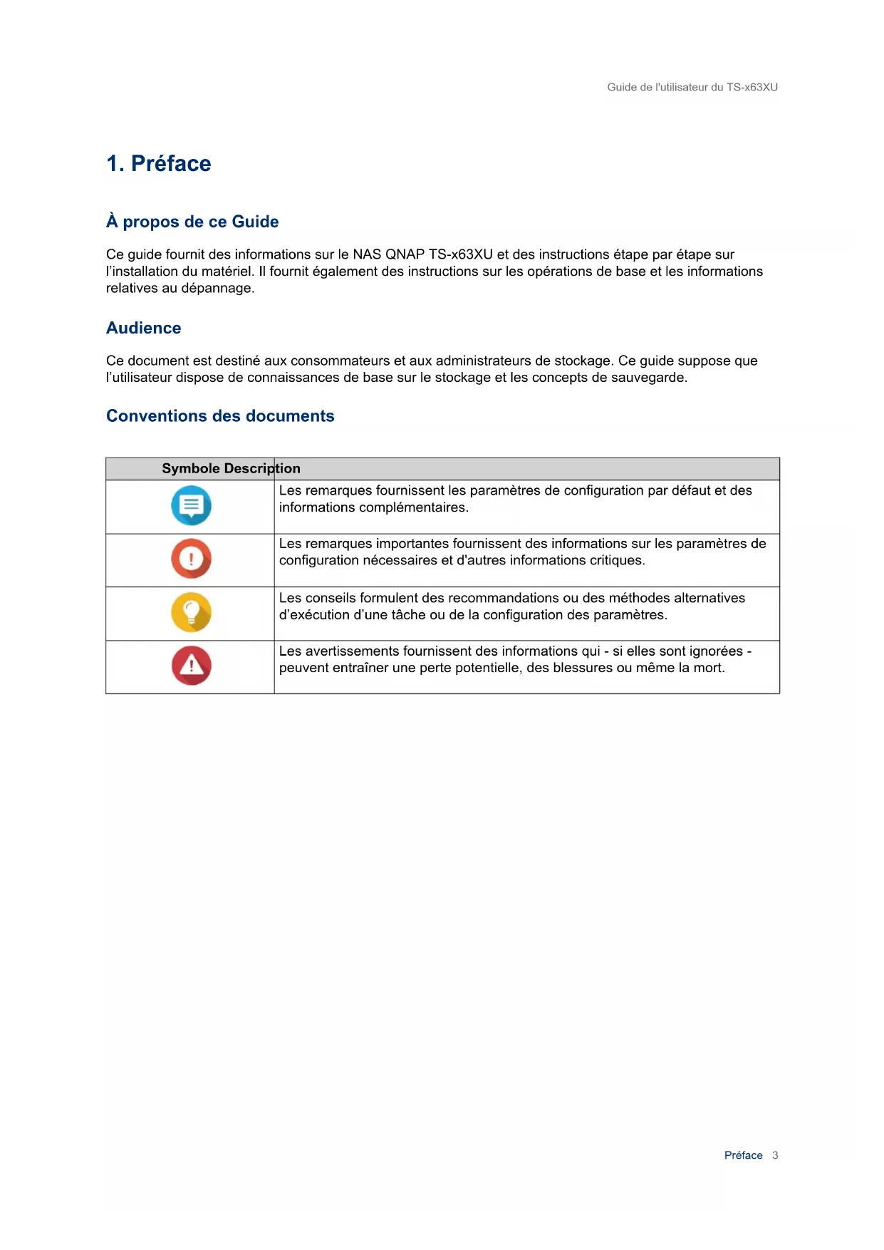 À propos de ce Guide Ce guide fournit des informations sur le NAS QNAP TS-x63XU et des instructions étape par étape sur l’installation du matériel. Il fournit également des instructions sur les opérations de base et les informations relatives au dépannage. Audience Ce document est destiné aux consommateurs et aux administrateurs de stockage. Ce guide suppose que l’utilisateur dispose de connaissances de base sur le stockage et les concepts de sauvegarde. Conventions des documents Symbole Description Les remarques fournissent les paramètres de configuration par défaut et des informations complémentaires. Les remarques importantes fournissent des informations sur les paramètres de configuration nécessaires et d'autres informations critiques. Les conseils formulent des recommandations ou des méthodes alternatives d’exécution d’une tâche ou de la configuration des paramètres. Les avertissements fournissent des informations qui - si elles sont ignorées - peuvent entraîner une perte potentielle, des blessures ou même la mort. Guide de l'utilisateur du TS-x63XU Préface 32. Présentation produit Ce chapitre fournit des informations de base sur le NAS QNAPTS-x63XU. À propos du TS-x63XU La gamme TS-x63XU est une solution professionnelle conçue pour le stockage de données, la sauvegarde, le partage et la gestion centralisée. Elle embarque un processeur quad-core AMD hautes performances cadencé à 2,0 GHz et épaulé par 4 Go de mémoire SODIMM DDR3L, avec possibilité de mise à niveau jusqu'à 16 Go. Chaque NAS TS-x63XU dispose d'une carte d'extension réseau 10GBASE-T pour une bande passante et un débit accrus. Avec son moteur de chiffrement AES-NI, le TS-x63XU accélère les performances des transferts de fichiers chiffrés. Le NAS est également équipé en termes d'extension avec ses ports USB 3.0 Type-A. Spécifications matérielles Important La modification du matériel ou du logiciel de votre produit QNAP annule sa garantie. QNAP décline toute responsabilité pour tout dommage ou perte de données causée par des modifications non autorisées et l’installation d’applications tierces non prises en charge. N/P commande Baies de disque Mémoire Alimentation TS-463XU-4G 4 4 Go Unique TS-463XU-RP-4G Redondant TS-863XU-4G 8 Unique TS-863XU-RP-4G Redondant TS-1263XU-4G 12 Unique TS-1263XU-RP-4G Redondant Composant TS-463XU TS-463XU-RP TS-863XU TS-863XU-RP TS-1263XU TS-1263XU-RP Processeur Processeur Processeur AMD quad-core 2,0 GHz Architecture 64 bits Moteur de chiffrement AES-NI Mémoire Modules mémoire pré- installés 1 x 4 Go de SODIMM DDR3L Utilisez uniquement des modules de mémoire QNAP non ECC (error correcting code) pour conserver les performances et maintenir la stabilité du système. Si votre NAS est équipé de plus d'une fiche mémoire, utilisez des modules QNAP non ECC avec des spécifications identiques. Important L'utilisation de modules non pris en charge peut réduire les performances, entraîner des erreurs ou empêcher le système d'exploitation de démarrer. Nombre total d'emplacements mémoire 2 x SODIMM DDR3L Guide de l'utilisateur du TS-x63XU Présentation produit 4Composant TS-463XU TS-463XU-RP TS-863XU TS-863XU-RP TS-1263XU TS-1263XU-RP Mémoire maximale 16 Go : 2 x 8 Go de SODIMM DDR3L Stockage Baies de disques 4 x SATA 6 Gbits/s 8 x SATA 6 Gbits/s 12 x SATA 6 Gbits/s Compatibilité des disques • Disques durs SATA 3,5 pouces