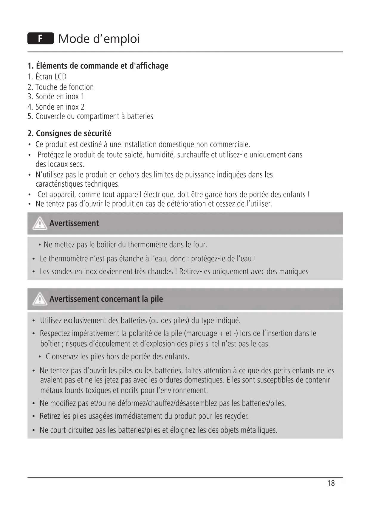- Les sondes en inox deviennent très chaudes ! Retirez-les uniquement avec des maniques Avertissement concernant la pile