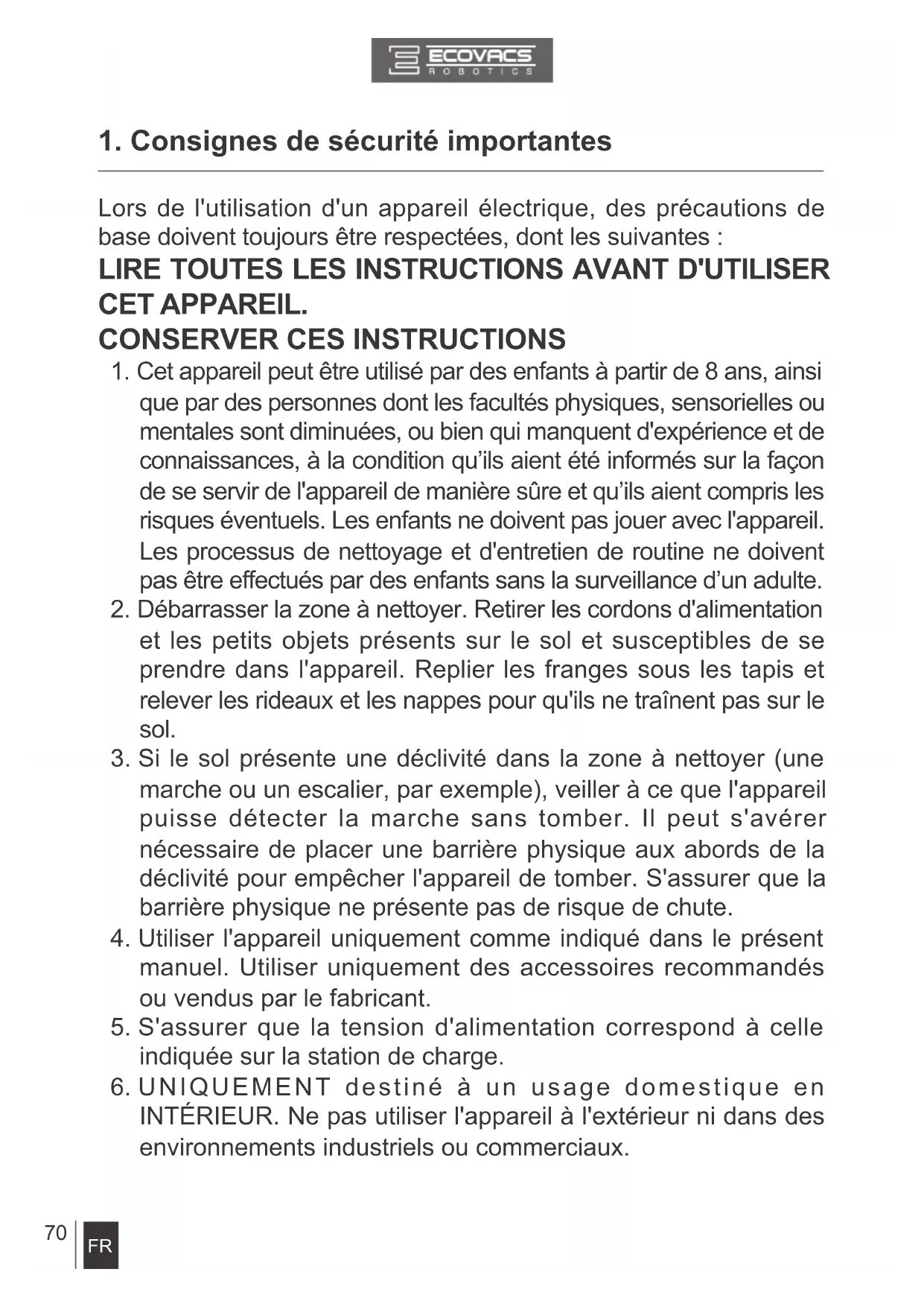 gurant dans ce manuel d'instructions. ECOVACS ROBOTICS ne peut être tenu responsable de tous dommages ou préjudices causés par une utilisation incorrecte.