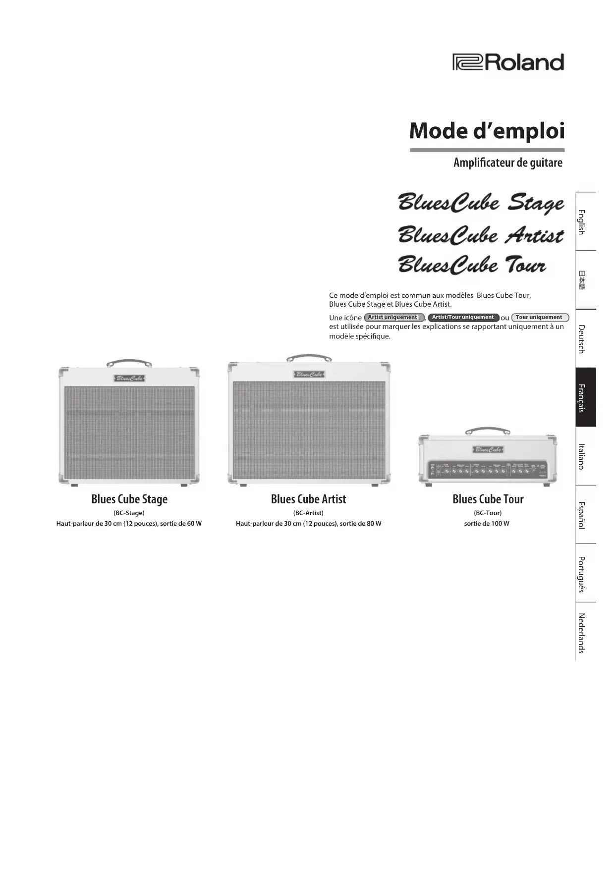 - Les noms des sociétés et des produits mentionnés dans ce document sont des marques ou des marques déposées de leurs propriétaires respectifs.• Roland, BOSS et CUBE sont des marques ou des marques déposées de Roland Corporation aux États-Unis et/ou dans d’autres pays.• MMP (Moore Microprocessor Portfolio) se réfère à un portefeuille de brevets relatifs à l’architecture des microprocesseurs, développés par TPL (Technology Properties Limited). Roland détient une licence de cette technologie du groupe TPL.• ASIO est une marque et un logiciel de Steinberg Media Technologies GmbH.• Ce produit contient la plate-forme logicielle intégrée eCROS d’eSOLCo.,Ltd. eCROS est une marque d’eSOLCo.,Ltd. au Japon.4 Présentation de votre nouveau Blues Cube Stage/Artist / Tour Introduction Félicitations! Vous avez le bon choix. Le Blues Cube est né de l’expertise technologique de Roland qui vous permet d’obtenir le meilleur son possible de votre guitare électrique. Pour que vous puissiez tirer le meilleur parti de votre Blues Cube, nous vous conseillons de lire le présent manuel. En règle générale, il n’est pas nécessaire de conserver les manuels d’amplicateur. Ce manuel, par contre, contient d’importantes informations sur ce qui permet d’optimiser votre ampli et d’obtenir un superbe son. L’amplicateur de guitare en tant qu’instrument de musique Une guitare électrique ne prend toute sa dimension que lorsqu’elle est branchée. Votre amplicateur peut de fait être considéré partie intégrante de l’instrument. Il est pour ainsi dire le corps d’une acoustique remarquable, qui apporte une contribution essentielle au son nal. Même une guitare vintage ne peut pas déployer tout son potentiel si vous utilisez un amplicateur médiocre. Une technologie Tube Logic qui a considérablement évolué La quête du son du Blues Cube a pour point de départ le composant de circuit de lampes de base identique à celui du Fender Bassman, et plus spéciquement: lampes 12AY7 et 2 étages de 12AX7 pour les lampes de préampli, réglages de son passifs, convertisseur de phase à paires longues, lampes de puissance 6L6GC avec méthode push-pull et transformateur de sortie. Sa section puissance contient une lampe de redressement GZ34, et la lampe de puissance utilise la méthode de polarisation xe. Les types d’alimentation tels que l’alimentation de type B+ ou C- sont des facteurs importants liés en profondeur à la courbe de gain ou de saturation de la lampe de puissance. Non seulement les types de lampe, mais également le mode d’alimentation jouent un rôle essentiel pour déterminer les caractéristiques du son de l’amplicateur. Le changement dynamique d’alimentation de la lampe de puissance joue un rôle non négligeable et génère un sentiment très satisfaisant pour les musiciens. C’est-à-dire que l’attaque et le maintien vont de paire, ou, en d’autres termes, l’impression d’attaque caractéristique et l’impression de compression de la lampe se conjuguent. Nous avons peauné l’équilibrage des réglages en fonction de ces impressions. Chaud, plein d’entrain, sensible, dynamique, élastique... ce sont tous les termes qu’utilisent les guitaristes pour décrire l’expérience satisfaisante de jouer sur leurs amplicateurs à lampes préférés. Grâce à la technologie Tube Logic de Roland, ces termes peuvent maintenant être appliqués au Blues Cube. L’évolution a été considérable depuis le son première génération des amplicateurs Blues Cube originaux des années 90. Aujourd’hui, la technologie Tube Logic émule avec précision le comportement complexe et hautement interactif des amplicateurs à lampes classiques dans ses moindres détails. Grâce à ce facteur magique, l’amplicateur, d’un simple système son, devient un instrument de musique à part entière. Sensations fortes, contrôle de la distorsion avec touché et volume, clarté du son, alimentation «compressée», et plus encore: tout ce que les guitaristes aiment sur un amplicateur à tube vintage nement réglé est généreusement présent sur le Blues Cube. Amplicateur de concert pour les musiciens professionnels Prêt pour les performances en direct, le Blues Cube Artist envoie 80 watts de puissance (60 watts pour le Blues Cube Stage) et est équipé d’un haut-parleur de 12 pouces personnalisé qui est conçu spécialement pour une réponse sonore maximale avec Tube Logic. Le cabinet ouvert à l’arrière inclut une structure de contreplaqué en peuplier, qui ore un son acoustiquement vibrant pour des performances solo ou en groupe.Deutsch Français Italiano Español PortuguêsEnglish NederlandsFrançais Présentation de votre nouveau Blues Cube Stage/Artist / Tour