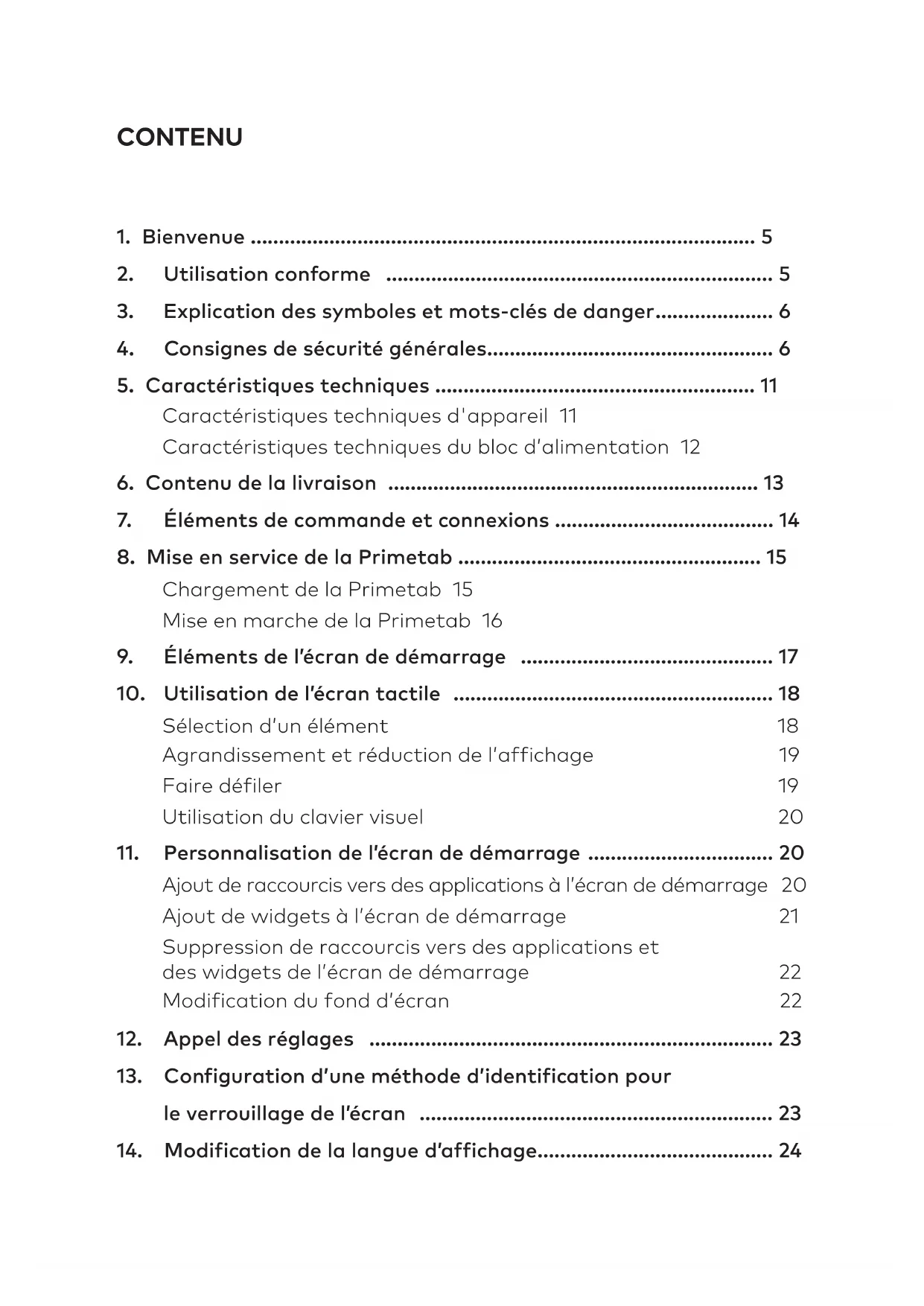 Chargement de la Primetab 15 Mise en marche de la Primetab 16