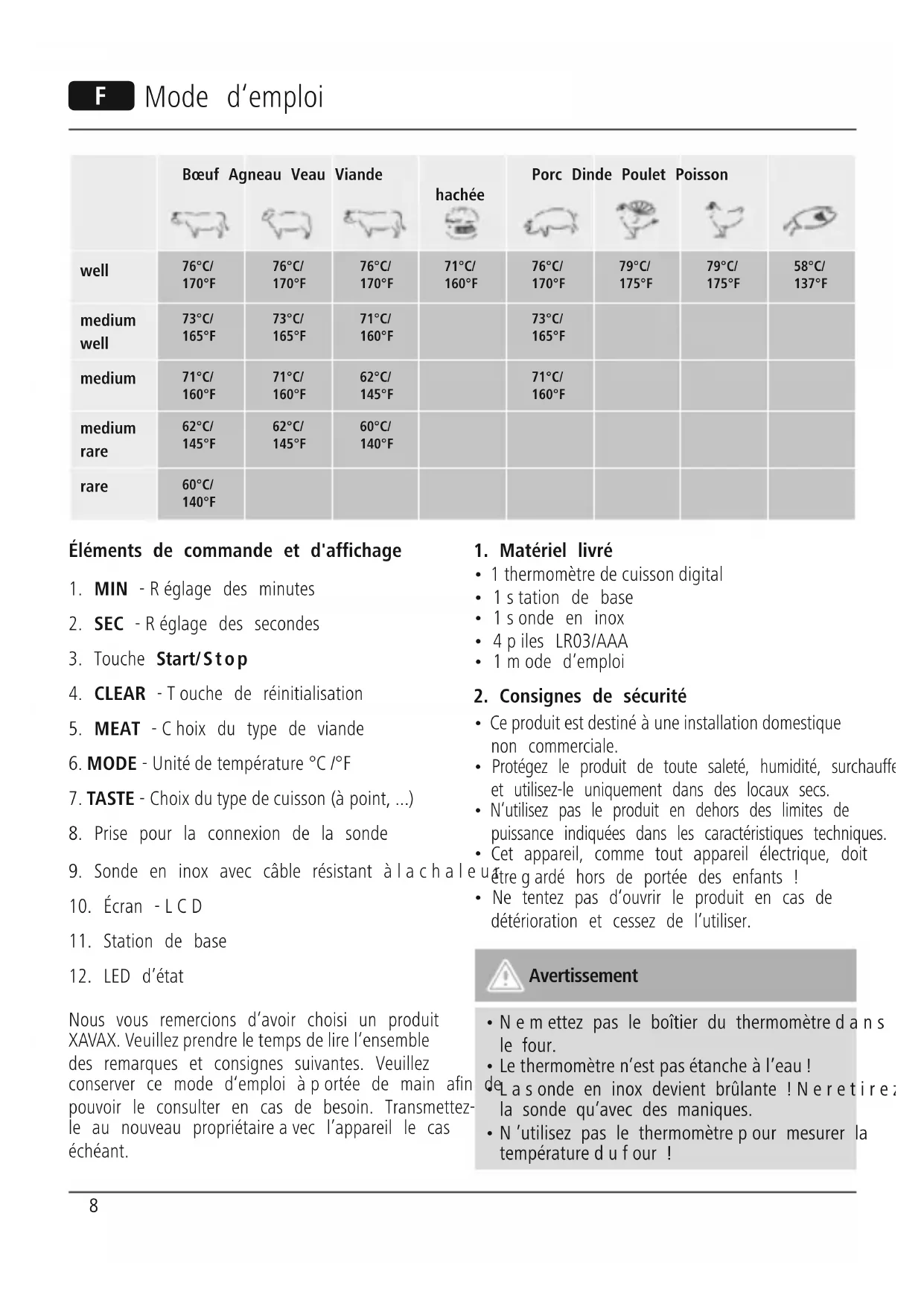 00111382 - Thermomètre pour aliments Xavax - Notice d'utilisation et mode d'emploi gratuit