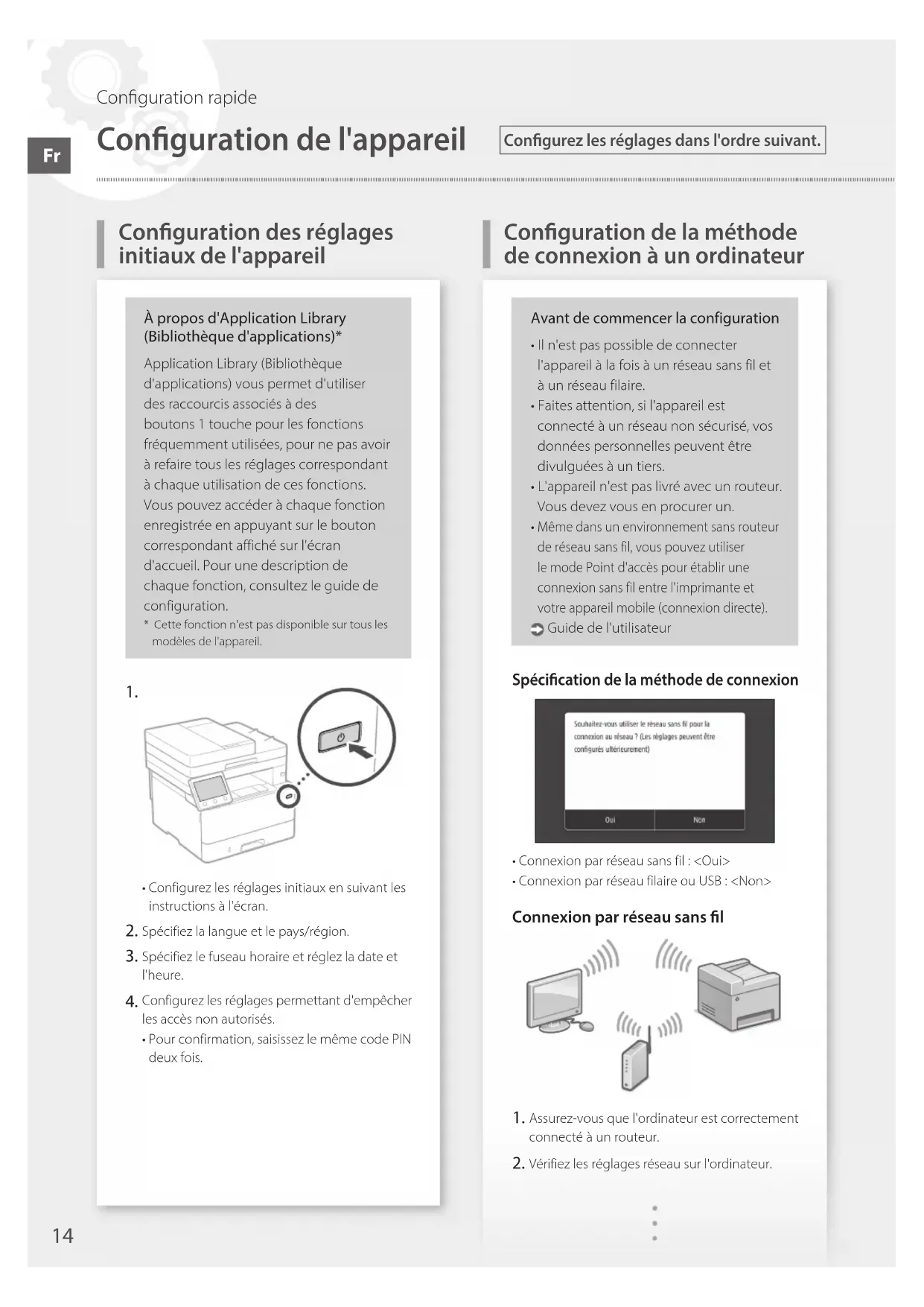 - Configurez les réglages initiaux en suivant les instructions à l'écran. Spécifiez la langue et le pays/région. Spécifiez le fuseau horaire et réglez la date et l'heure. Configurez les réglages permettant d'empêcher les accès non autorisés.• Pour confirmation, saisissez le même code PIN deux fois.Avant de commencer la configuration• Il n'est pas possible de connecter l'appareil à la fois à un réseau sans fil et à un réseau filaire.• Faites attention, si l'appareil est connecté à un réseau non sécurisé, vos données personnelles peuvent être divulguées à un tiers.• L'appareil n'est pas livré avec un routeur. Vous devez vous en procurer un. Même dans un environnement sans routeur de réseau sans fil, vous pouvez utiliser le mode Point d'accès pour établir une connexion sans fil entre l'imprimante et votre appareil mobile (connexion directe). Guide de l'utilisateurSpécication de la méthode de connexion• Connexion par réseau sans fil: <Oui>• Connexion par réseau filaire ou USB: <Non>Connexion par réseau sans l Assurez-vous que l'ordinateur est correctement connecté à un routeur. Vérifiez les réglages réseau sur l'ordinateur.