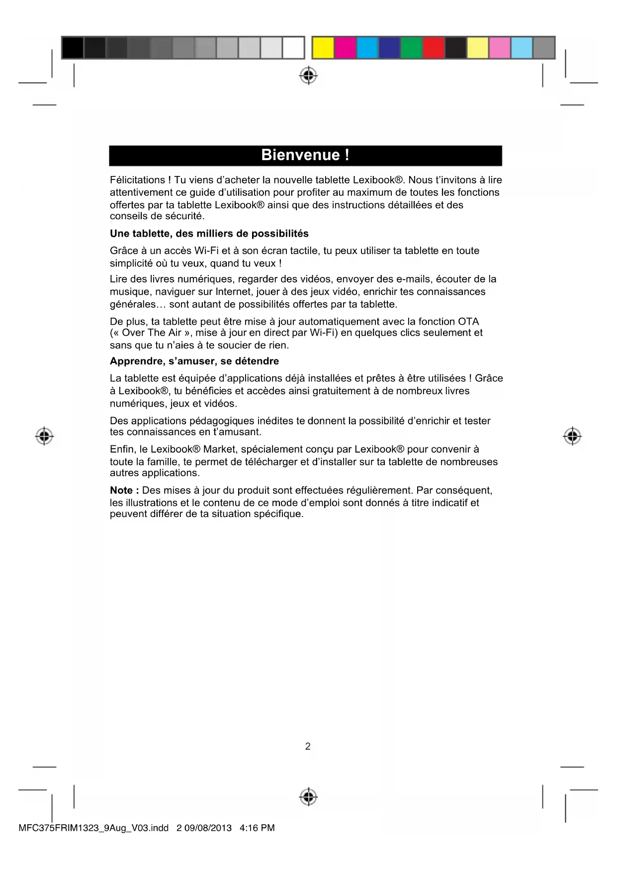Bienvenue ! Félicitations ! Tu viens d’acheter la nouvelle tablette Lexibook®. Nous t’invitons à lire attentivement ce guide d’utilisation pour profiter au maximum de toutes les fonctions offertes par ta tablette Lexibook® ainsi que des instructions détaillées et des conseils de sécurité. Une tablette, des milliers de possibilités Grâce à un accès Wi-Fi et à son écran tactile, tu peux utiliser ta tablette en toute simplicité où tu veux, quand tu veux ! Lire des livres numériques, regarder des vidéos, envoyer des e-mails, écouter de la musique, naviguer sur Internet, jouer à des jeux vidéo, enrichir tes connaissances générales… sont autant de possibilités offertes par ta tablette. De plus, ta tablette peut être mise à jour automatiquement avec la fonction OTA (« Over The Air », mise à jour en direct par Wi-Fi) en quelques clics seulement et sans que tu n’aies à te soucier de rien. Apprendre, s’amuser, se détendre La tablette est équipée d’applications déjà installées et prêtes à être utilisées ! Grâce à Lexibook®, tu bénéficies et accèdes ainsi gratuitement à de nombreux livres numériques, jeux et vidéos. Des applications pédagogiques inédites te donnent la possibilité d’enrichir et tester tes connaissances en t’amusant. Enfin, le Lexibook® Market, spécialement conçu par Lexibook® pour convenir à toute la famille, te permet de télécharger et d’installer sur ta tablette de nombreuses autres applications. Note : Des mises à jour du produit sont effectuées régulièrement. Par conséquent, les illustrations et le contenu de ce mode d’emploi sont donnés à titre indicatif et peuvent différer de ta situation spécifique. MFC375FRIM1323_9Aug_V03.indd 2 09/08/2013 4:16 PM2
