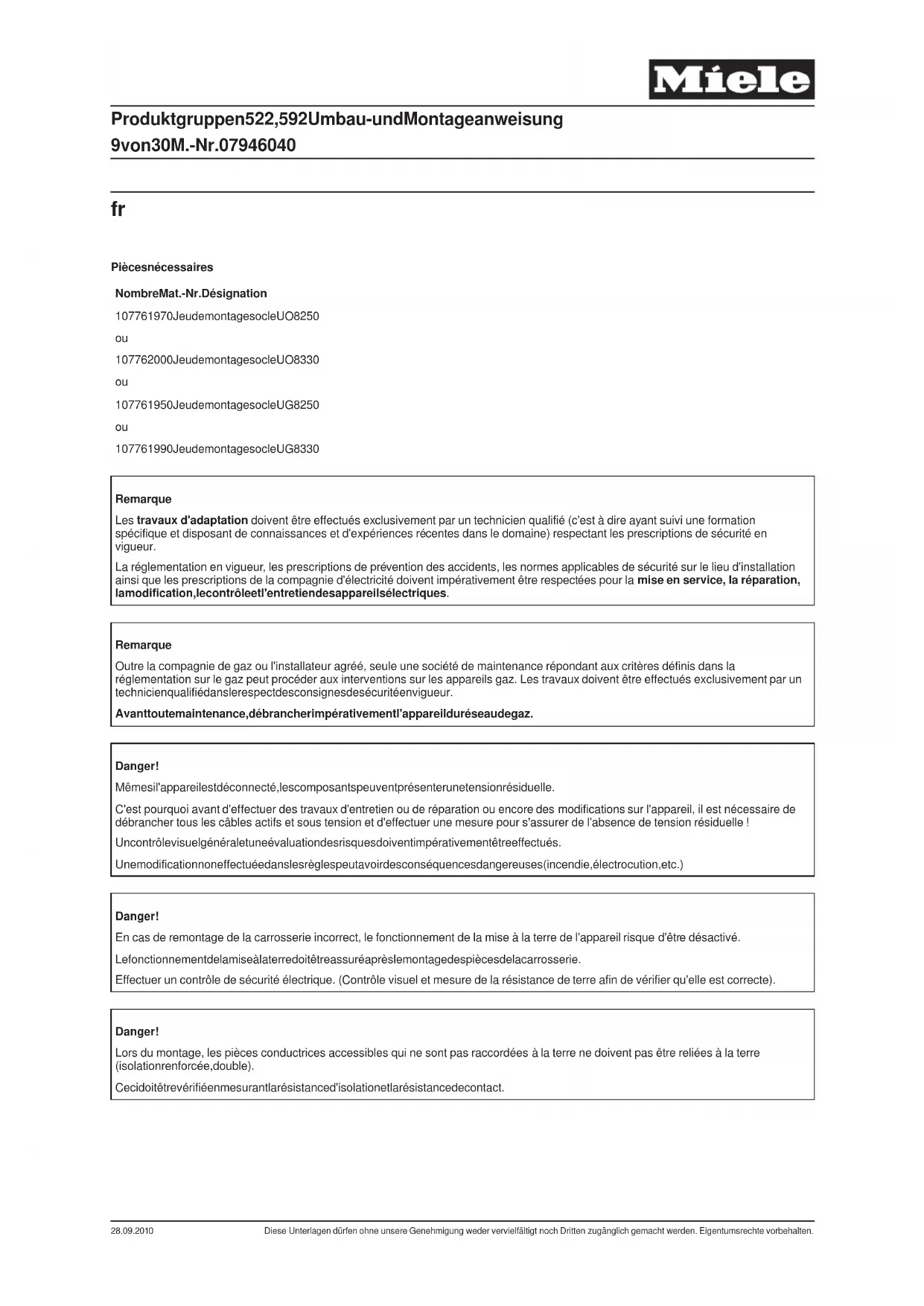 1 07761990 Jeu de montage socle UG 8330 Remarque Les travaux d'adaptation doivent être effectués exclusivement par un technicien qualifié (c'est à dire ayant suivi une formation spécifique et disposant de connaissances et d'expériences récentes dans le domaine) respectant les prescriptions de sécurité en vigueur. La réglementation en vigueur, les prescriptions de prévention des accidents, les normes applicables de sécurité sur le lieu d'installation ainsi que les prescriptions de la compagnie d'électricité doivent impérativement être respectées pour la mise en service, la réparation, la modification, le contrôle et l'entretien des appareils électriques. Remarque Outre la compagnie de gaz ou l'installateur agréé, seule une société de maintenance répondant aux critères définis dans la réglementation sur le gaz peut procéder aux interventions sur les appareils gaz. Les travaux doivent être effectués exclusivement par un technicien qualifié dans le respect des consignes de sécurité en vigueur. Avant toute maintenance, débrancher impérativement l'appareil du réseau de gaz. Danger ! Même si l'appareil est déconnecté, les composants peuvent présenter une tension résiduelle. C'est pourquoi avant d'effectuer des travaux d'entretien ou de réparation ou encore des modifications sur l'appareil, il est nécessaire de débrancher tous les câbles actifs et sous tension et d'effectuer une mesure pour s'assurer de l'absence de tension résiduelle ! Un contrôle visuel général et une évaluation des risques doivent impérativement être effectués. Une modification non effectuée dans les règles peut avoir des conséquences dangereuses (incendie, électrocution, etc.) Danger ! En cas de remontage de la carrosserie incorrect, le fonctionnement de la mise à la terre de l'appareil risque d'être désactivé. Le fonctionnement de la mise à la terre doit être assuré après le montage des pièces de la carrosserie. Effectuer un contrôle de sécurité électrique. (Contrôle visuel et mesure de la résistance de terre afin de vérifier qu'elle est correcte). Danger ! Lors du montage, les pièces conductrices accessibles qui ne sont pas raccordées à la terre ne doivent pas être reliées à la terre (isolation renforcée, double). Ceci doit être vérifié en mesurant la résistance d'isolation et la résistance de contact. Produktgruppen 522, 592 Umbau- und Montageanweisung 9 von 30 M.-Nr. 07946040 28.09.2010 Diese Unterlagen dürfen ohne unsere Genehmigung weder vervielfältigt noch Dritten zugänglich gemacht werden. Eigentumsrechte vorbehalten.Danger ! Risque de blessure lors du montage