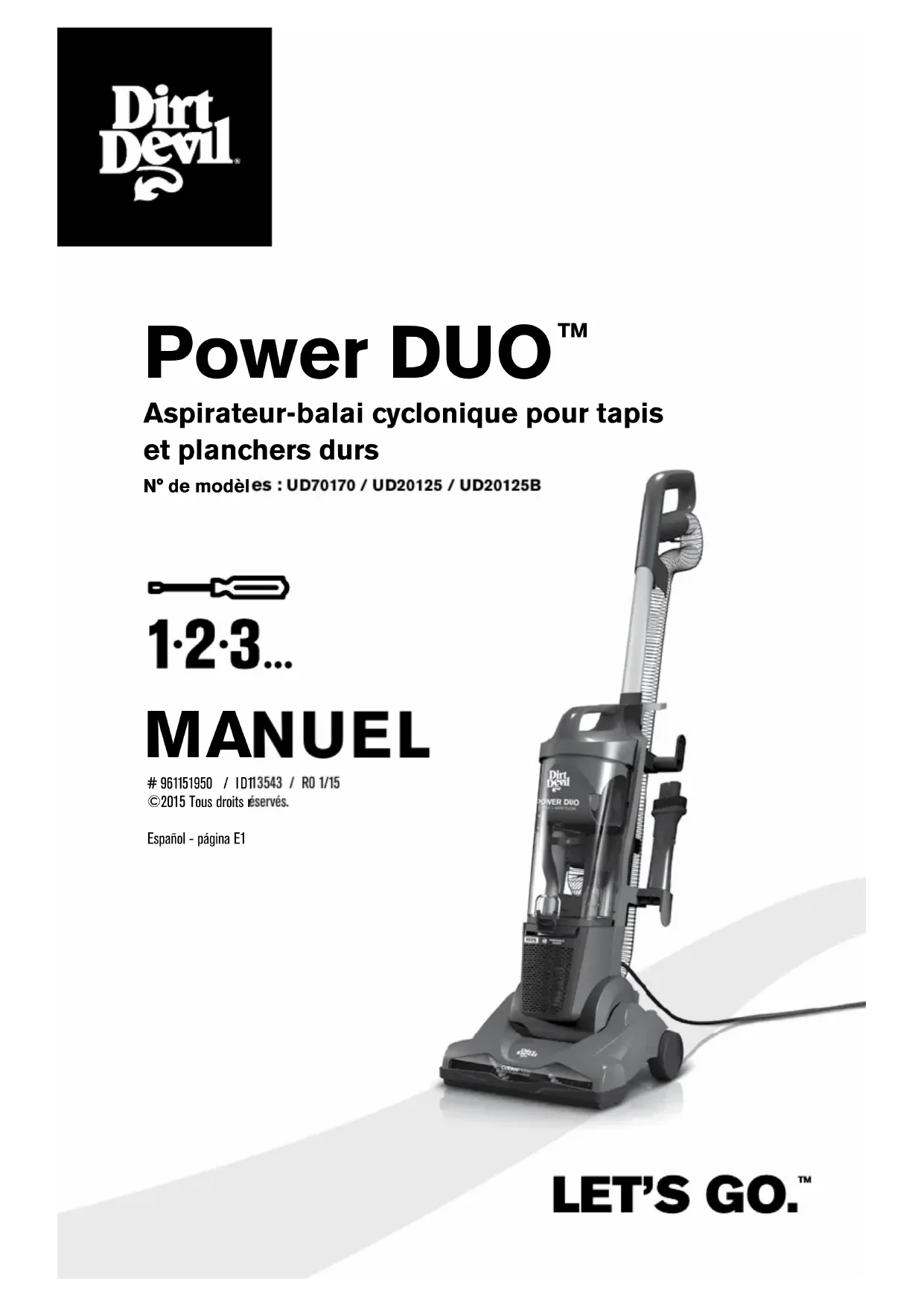 Aspirateur-balai cyclonique pour tapis et planchers durs MANUEL # 961151950 / ID113543 / R0 1/15 ©2015 Tous droits réservés.Español - página E1 N° de modèles : UD70170 / UD20125 / UD20125BBONJOUR! BIENVENUE ENREGISTREMENT DU PRODUIT Veuillez inscrire les renseignements de votre appareil ci-dessous afin de les consulter rapidement.No de modèle : Code du fabricant : (Vous trouverez le code du fabricant à l'arrière ou au bas de l'appareil) Enregistrement de la garantie Assurez-vous d'enregistrer votre produit en ligne sur le site www.dirtdevil.com ou en appelant au numéro 1 800 321-1134. Conseil : Brochez vos reçus d'achat à ce manuel du propriétaire La vérification de la date d'achat peut être requise pour une réparation au titre de la garantie de votre produit DirtDevil