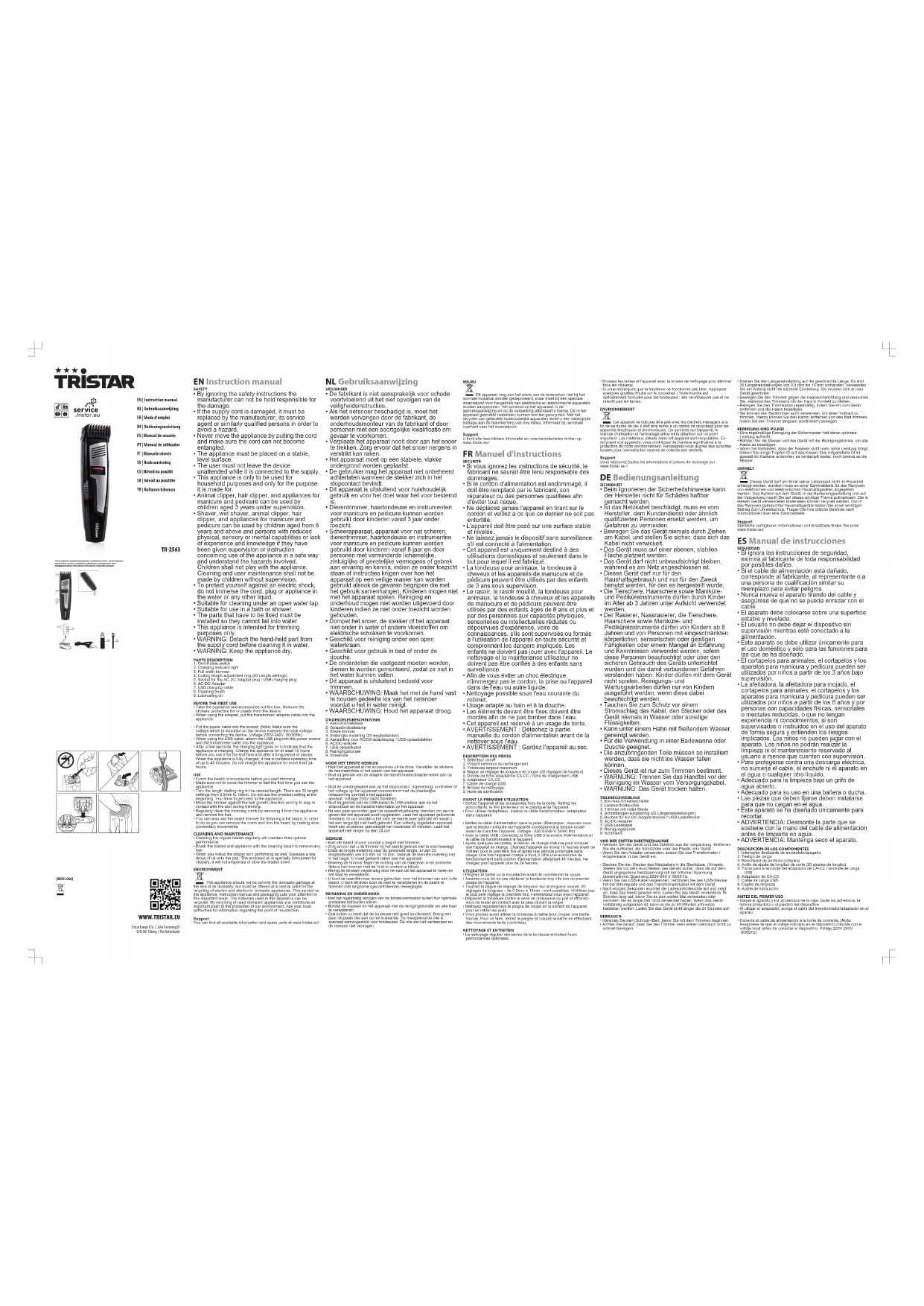 - AVERTISSEMENT: Gardez l’appareil au sec. DESCRIPTION DES PIÈCES1. Sélecteur on/off2. Voyant lumineux de rechargement3. Tondeuse largeur maximum4. Bague de réglage de longueur de coupe (20 réglages de hauteur)5. Douille de fiche adaptatrice CA-CC / fiche de chargement USB6. Adaptateur CA-CC7. Câble de charge USB8. Brosse de nettoyage9. Huile de lubrificationAVANT LA PREMIÈRE UTILISATION• Sortez l'appareil et les accessoires hors de la boîte.Retirez lesautocollants, le film protecteur ou le plastique de l'appareil.• Pour utiliser l'adaptateur, insérez le câble transformateur /adaptateurdans l'appareil.• Mettez le câble d'alimentation dans la prise.(Remarque : Assurez-vousque la tension indiquée sur l'appareil correspond à la tension localeavant de brancher l'appareil.Voltage : 220 V-240 V 50-60 Hz)• Avec le câble USB, connectez la fiche USB à la source d'alimentation etle câble de transformateur à l'appareil.• Après quelques secondes, le témoin de charge s'allume pour indiquerque l'appareil se charge. Chargez l'appareil au moins 16 heures avant del'utiliser pour la première fois et après une période prolongée sansusage. Une fois l'appareil chargé à fond, il offre une autonomie defonctionnement sans cordon d'alimentation atteignant 45 minutes. Nechargez pas l'appareil plus de 24 heures.UTILISATION• Peignez la barbe ou la moustache avant de commencer la coupe.• Assurez-vous de ne pas déplacer la tondeuse trop vite lors du premierusage de l'appareil.• Tournez la bague de réglage de longueur sur la longueur voulue. 20réglages de longueur - de 0,5mm à 10mm - sont possibles. N'utilisez pasle plus petit réglage la première fois. Familiarisez-vous avec l'appareil.• Déplacez la tondeuse contre le sens de croissance du poil et efforcez-vous de rester en contact avec la peau durant la coupe.• Nettoyez régulièrement le peigne de coupe en le sortant de l'appareilpour en retirer les poils.• Vous pouvez aussi utiliser la tondeuse à barbe pour couper une barbefournie. Pour ce faire, retirez le peigne et coupez la barbe en effectuantdes mouvements lents (contrôlés).NETTOYAGE ET ENTRETIEN• Le nettoyage régulier des lames de la tondeuse entretient leursperformances optimales.• Brossez les lames et l'appareil avec la brosse de nettoyage pour éliminertous les cheveux.• Si vous remarquez que la tondeuse ne fonctionne pas bien. Appliquezquelques gouttes d'huile sur le coussinet. L'huile fournie estspécialement formulée pour les tondeuses : elle ne s'évapore pas et neralentit pas les lames.ENVIRONNEMENTCet appareil ne doit pas être jeté avec les déchets ménagers à lafin de sa durée de vie, il doit être remis à un centre de recyclage pour lesappareils électriques et électroniques. Ce symbole sur l'appareil, lemanuel d'utilisation et l'emballage attire votre attention sur un pointimportant. Les matériaux utilisés dans cet appareil sont recyclables. Enrecyclant vos appareils, vous contribuez de manière significative à laprotection de notre environnement. Renseignez-vous auprès des autoritéslocales pour connaître les centres de collecte des déchets.SupportVous retrouvez toutes les informations et pièces de rechange surwww.tristar.eu! DEBedienungsanleitung SICHERHEIT