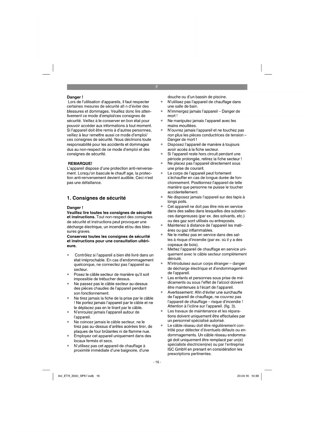 l’aff ectation L’appareil est uniquement conçu pour servir de chauff age supplémentaire dans des endroits secs et fermés. Il est exclusivement conçu pour la mise en place sur le sol. La machine doit exclusivement être employée conformément à son aff ectation. Chaque uti- lisation allant au-delà de cette aff ectation est considérée comme non conforme. Pour les dommages en résultant ou les blessures de tout genre, le producteur décline toute responsabilité et l’opérateur/l’exploitant est responsable. Veillez au fait que nos appareils, conformément à leur aff ectation, n’ont pas été construits, pour être utilisés dans un environnement profession- nel, industriel ou artisanal. Nous déclinons toute responsabilité si l’appareil est utilisé profession- nellement, artisanalement ou dans des sociétés industrielles, tout comme pour toute activité équivalente. Anl_ETH_2000_SPK7.indb 17Anl_ETH_2000_SPK7.indb 17 20.04.16 10:3920.04.16 10:39F
