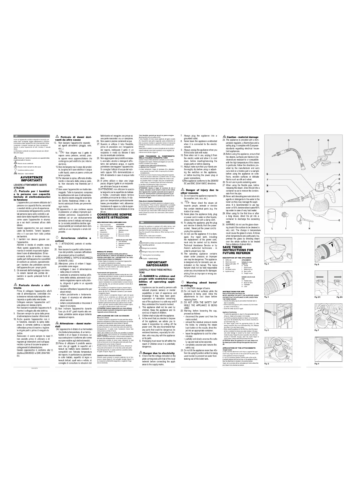 Ne touchez pas les superficies chau-20. des pendant l’utilisation du produit Laissez refroidir les accessoires avant de les remplacer. NÊOUVREZ PAS LE BOUCHON DE 21. SURETE DURANT LÊEMPLOI. Attention : avant de dévisser le bou-22. chon, procéder comme suit : débrancher le câble d’alimentation de • la prise de courant ; décharger la pression résiduelle à • l’intérieur de la chaudière en action- nant le bouton de distribution de la vapeur sur la buse et en dirigeant le jet dans un récipient adéquat ; laisser refroidir l’appareil pendant • quelques minutes ; dévisser partiellement et lentement • le bouchon de sécurité et attendre quelques secondes ; dévisser complètement et ôter le • bouchon de sécurité. Ne penchez pas l’appareil à plus de 23. 45oen cours d’utilisation car de l’eau bouillante pourrait sortir en même temps que la vapeur. Attention – dommages matériels L’appareil est équipé d’un thermostat 24. qui limite la température, d’un fusi- ble et d’un bouchon de sécurité. Sa conception est conforme aux normes européennes concernant les appareils électroménagers. Avant d’utiliser le produit, assurez-vous 25. que les objets, les surfaces et les tissus à traiter sont résistants ou com- patibles avec la température élevée de la vapeur. En particulier sur les sols en terre cuite traitée, surfaces en bois et tissus fragiles comme soie et velours, il est conseillé de consulter les instructions du fabricant et d’effectuer un essai sur un angle caché ou sur un échantillon. Ne pas utiliser dans des piscines conte-26. nant de l’eau. Lorsqu’on utilise le tuyau souple, 27. avant de distribuer la vapeur, dirigez le jet dans un récipient afin d’enlever le condensat du tuyau. Ne jamais ajouter de produits déca-28. pants, aromatiques, alcoolisés ou détergents à l’intérieur du réservoir d’eau, car ils pourraient endomma- ger l’appareil. Il est conseillé d’utiliser de l’eau du robinet ou de l’eau 50% déminéralisée/50% du robinet en cas d’eau très dure. A la première utilisation après une 29. longue pause, diriger le jet dans un récipient pour éliminer l’eau en excès. ATTENTION: n’utilisez pas la brosse 30. lave-vitre si la surface a traiter est froide. L’écart de température peut en provoquer la rupture. Durant les sai- sons où la température est particuliè- rement basse, préchauffer les vitres en distribuant de la vapeur sur toute la surface à traiter à une distance d’envi- ron 40 cm. CONSERVEZ CES INSTRUCTIONS DESCRIPTION DE L’APPAREIL A Bouchon de sécuritéB Curseur blocage vapeurC Bouton distribution vapeur D PoignéeE Voyant allumageF Buse articuléeG Corps de l’appareilACCESSOIRESValables pour mod. 4132/4133:H EntonnoirI Petite brosse rondeL Récipient graduéM Bec inclinéN Bec avec lanceValables seulement pour mod. 4133:O Tube soupleP Brosse pour tissusQ lave-vitreR LingeMODE D’EMPLOI:Remplissage du réservoir de la chaudière avant utilisationNE JAMAIS DEVISSER LE BOUCHON DE SECURITE (A) AVANT DE S’ETRE ASSURE QUE L’APPAREIL EST DEBRANCHE DE LA PRISE DE COURANT.- Dévissez le bouchon de sécurité (A) et retournez l’appareil pour vider complètement la chaudière.- Au moyen de l’entonnoir (H), versez une mesure (L) d’eau bien pleine dans la chaudière (figure A).- Revissez le bouchon de sécurité (A).Fonctionnement de l’appareil- Pour allumer l’appareil, brancher la prise du câble d’alimen- tation au secteur, le voyant (E) s’allume. Au bout de 3/4 minutes, la vapeur est prête. - Afin d’empêcher toute activation accidentelle de la distribution de la vapeur, il est nécessaire de faire glisser vers l’arrière le curseur de blocage de la vapeur (B) (Fig. D/2) ; pour le déblo-cage, déplacer le curseur (B) vers l’avant (Fig. D/1).- Pour procéder à la distribution de la vapeur, appuyer sur le bouton prévu à cet effet (C), après avoir déplacé vers l’avant le curseur de blocage (B) (Fig. D/1). Relâcher le bouton (C) pour interrompre la distribution de la vapeur.- A la première utilisation, il est conseillé de diriger le jet de vapeur vers l’intérieur d’un récipient pour éliminer toute trace d’eau résiduelle dans le tube (l’éventuelle sortie d’eau est due à la condensation de la vapeur à l’intérieur du tube). Répéter cette opération même après quelques minutes d’interruption. Dans tous les cas, quand la buse commence à distribuer de la vapeur, il est conseillé de toujours diriger le jet vers le bas. ATTENTION : Quand l’appareil est au repos, toujours bloquer le bouton de distribution de la vapeur grâce au curseur de blocage (B) prévu à cet effet.APPLICATION DES DIFFÉRENTS ACCES-SOIRESBec long:a) mettez l’accessoire en place en le poussant jusqu’à la partie fixe de l’appareil et en alignant la ligne gravée sur le bec avec la ligne jaune située sur l’appareil comme indiqué à figure B;b) tournez dans le sens indiqué par la flèche (sens des aiguilles d’une montre), en alignant le repère sur l’accessoire et les deux lignes sur la partie fixe de l’appareil. De cette manière, l’acces-soire reste fixe dans la position centrale de blocage.Vapori Jet est équipé d’une articulation qui permet d’orienter le jet de vapeur dans la position convenant le mieux pour l’utili-sation: monter l’accessoire à bec long sans le pousser à fond mais seulement jusqu’à ce qu’il couvre le joint circulaire de couleur verte, en alignant le repère sur le bec et la ligne jaune sur la partie fixe de l’appareil comme indiqué à fig. B.Tournez dans le sens indiqué par la flèche (sens des aiguilles d’une montre), en alignant le repère sur l’accessoire et les deux lignes sur la partie fixe de l’appareil. Dans cette position, il est possible d’orienter le jet de vapeur (Figure C.)Brosse ronde et bec incurvé:Ces deux accessoires peuvent se monter aussi bien sur le bec long (F