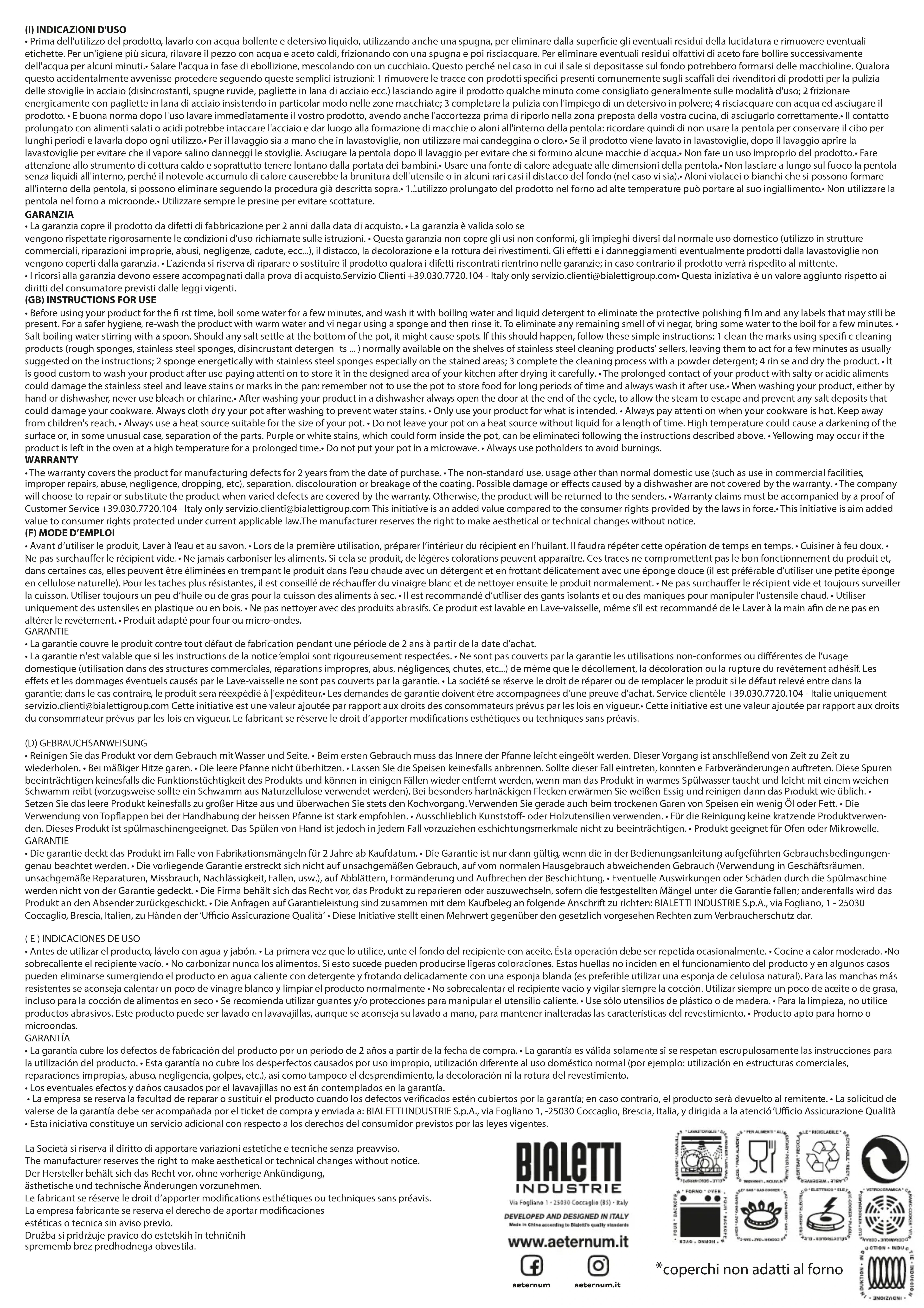 - La garantie n'est valable que si les instructions de la notice emploi sont rigoureusement respectées. • Ne sont pas couverts par la garantie les utilisations non-conformes ou différentes de l'usage domestique (utilisation dans des structures commerciales, réparations impropres, abus, négligences, chutes, etc...) de même que le décollement, la décoloration ou la rupture du revétement adhésiF. Les effets et les dommages éventuels causés par le Lave-vaiselle ne sont pas couverts par la garantie. • La société se reserve le droit de réparer ou de replacer le produit si le défaut relevé entre dans la garantie; dans le cas contraire, le produit sera réexpédé à l'expéditeur. • Les demandes de garantie doivent être encourçées d'une preuve d'achat. Service clientèle +39.030.7720.104 - Italie uniquement servicedio.clienti@bialettigroup.com Cette initiative est une valeur ajustée par rapport aux droits des consommateurs prévus par les bois en vigueur. • Cette initiative est une valeur ajustée par rapport aux droits du consommateur prévus par les bois en vigueur. Le fabricant se reserve le droit d'apporter modifications esthetiques ou techniques sans préavis.
