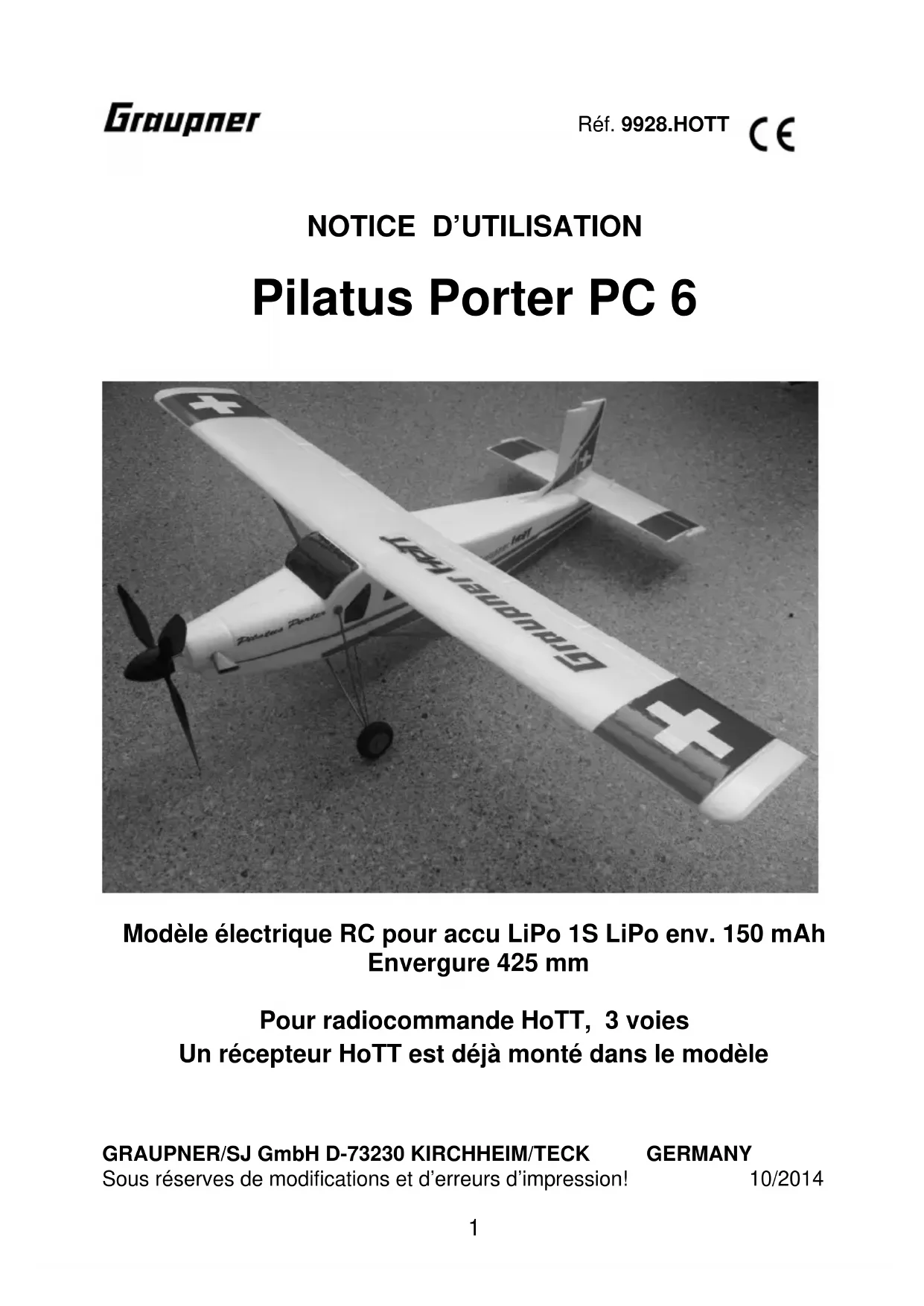 Modèle électrique RC pour accu LiPo 1S LiPo env. 150 mAh Envergure 425 mm Pour radiocommande HoTT, 3 voies Un récepteur HoTT est déjà monté dans le modèleGRAUPNER/SJ GmbH D-73230 KIRCHHEIM/TECK GERMANY Sous réserves de modifications et d’erreurs d’impression! 10/2014
