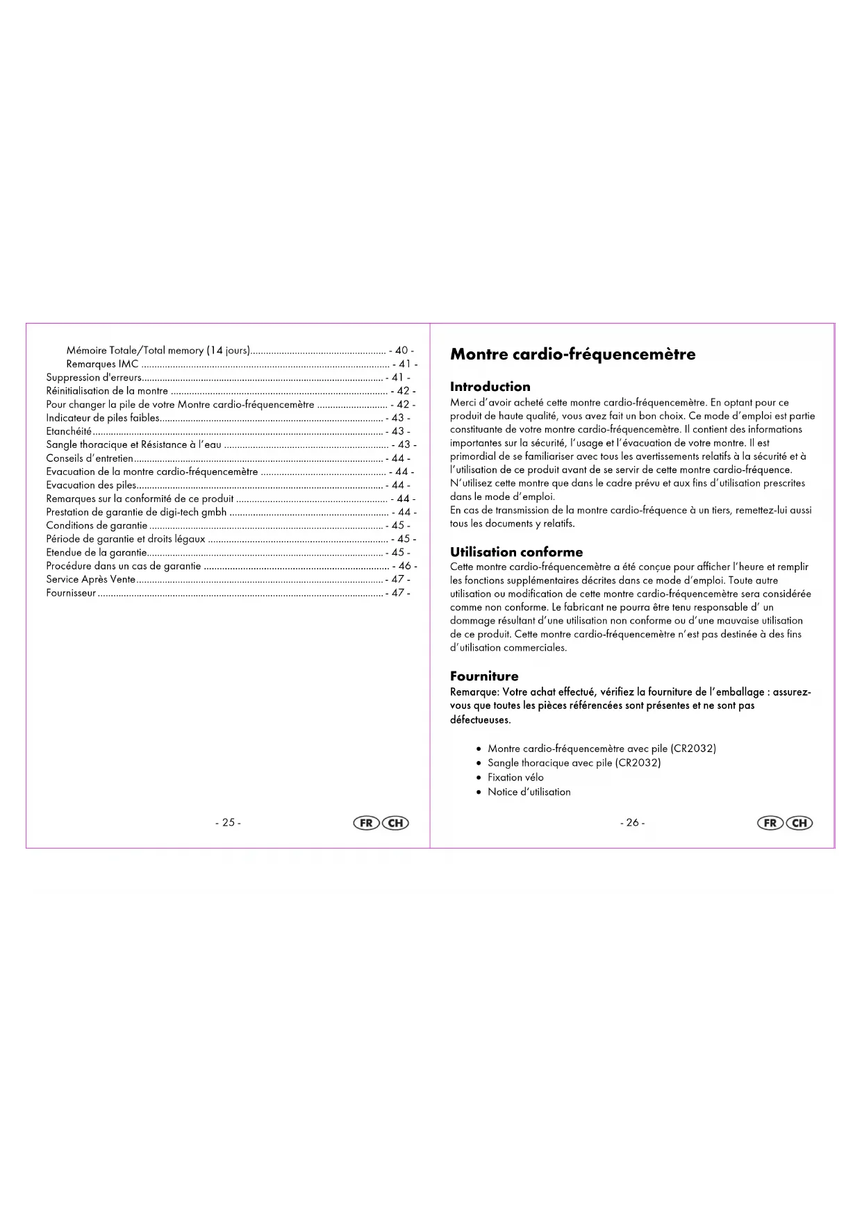 Conseils d’entretien Ne nettoyez les appareils qu’avec un chiffon sec ne faisant pas de peluches, comme pour le nettoyage des verres de lunettes par exemple. Après chaque utilisation, veuillez nettoyer votre sangle thoracique et le bracelet de votre montre avec un peu d’eau tiède ou d’eau savonneuse et une éponge. Attention: la montre en soi ne doit jamais être mouillée ! Essuyez bien tout ensuite avec un chiffon doux et accrochez la sangle pour la faire sécher. La sueur et les salissures perturbent le bon fonctionnement de l’émetteur. Evacuation de la montre cardio-fréquencemètre La montre cardio-fréquencemètre ne doit pas être évacuée avec les déchets ménagers. Veuillez faire évacuer celle-ci par l’intermédiaire d’un prestataire agréé ou de votre décharge municipale. Respectez les directives d’évacuation en vigueur. En cas de doute, demandez conseil auprès de votre décharge municipale. Evacuation des piles Evacuation adéquate des piles usagées dans les conteneurs mis à cet effet à votre disposition dans les points de vente. Ne jetez jamais vos piles avec vos déchets ménagers! Veuillez les faire évacuer par l’intermédiaire d’un prestataire agréé ou évacuez-les dans votre décharge municipale. Respectez les directives en vigueur. En cas de doute, demandez conseil auprès de votre décharge municipale. Remarques sur la conformité de ce produit Ce produit, manipulé de manière conforme aux prescriptions, satisfait aux exigences fondamentales du § 3 et autres dispositions du FTEG (art. 3 du R&TTE). Vous obtiendrez une déclaration de conformité en vous adressant sur internet à : conformity@digi-tech-gmbh.com Prestation de garantie de digi-tech gmbh Nous accordons 3 ans de garantie sur cette montre à partir de la date de l’achat. En cas de vice de fabrication, vous bénéficiez de droits légaux à l’égard du-