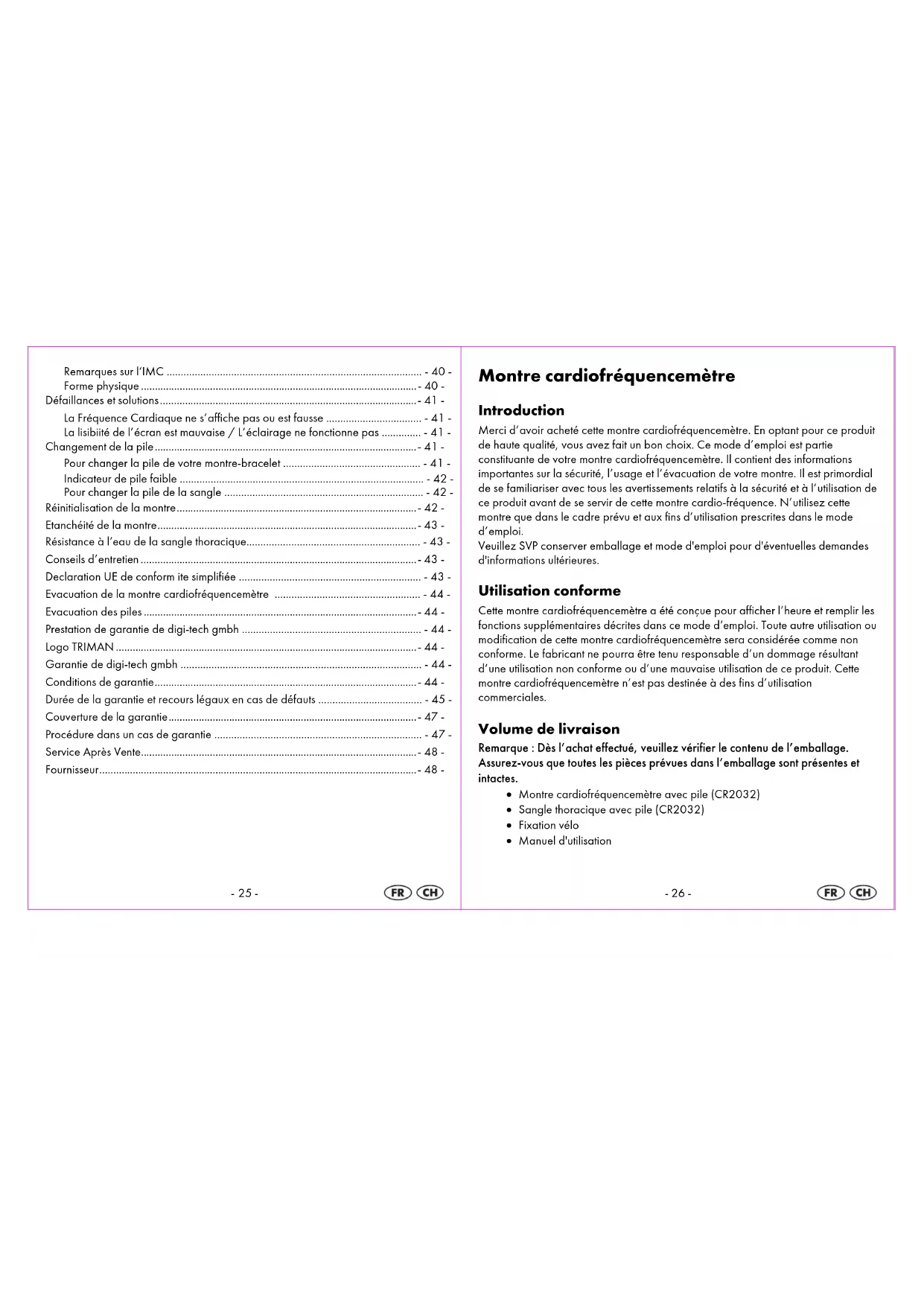 Evacuation de la montre cardiofréquencemètre La montre cardiofréquencemètre ne doit pas être évacuée avec les déchets ménagers. Veuillez faire évacuer celle-ci par l’intermédiaire d’un prestataire agréé ou de votre décharge municipale. Respectez les directives d’évacuation en vigueur. En cas de doute, demandez conseil auprès de votre décharge municipale. Evacuation des piles Evacuation adéquate des piles usagées dans les conteneurs mis à votre disposition dans les points de vente. Ne jetez jamais de piles avec des déchets ménagers. Veuillez les faire évacuer par l’intermédiaire d’un prestataire agréé ou de votre décharge municipale. Respectez les directives d’évacuation en vigueur. En cas de doute, demandez conseil auprès de votre décharge municipale. Prestation de garantie de digi-tech gmbh Nous accordons 3 ans de garantie sur cette montre cardiofréquencemètre à partir de la date de l’achat. En cas de vice de fabrication, vous bénéficiez de droits légaux à l’égard du vendeur de ce produit. Ces droits légaux ne sont en rien limités par les conditions de garantie décrites ci-après. Logo TRIMAN Ce produit est recyclable, il est soumis à un dispositif de responsabilité élargie du producteur et de collecte séparée. Garantie de digi-tech gmbh Vous recevez une garantie de 3 ans à partir de la date d’achat de cet appareil. En cas de défauts sur cet appareil, vous bénéficiez de recours légaux contre le vendeur du produit. Ces droits légaux ne sont pas limités par notre garantie décrite ci-après. Conditions de garantie La période de garantie commence à partir de la date de l‘achat. Veuillez conserver soigneusement votre ticket de caisse en original. Ce document est nécessaire comme preuve d‘achat. En cas de vice dû à un défaut de matériel ou de fabrication révélé au cours de la période de garantie, soit pendant 3 ans à partir de la