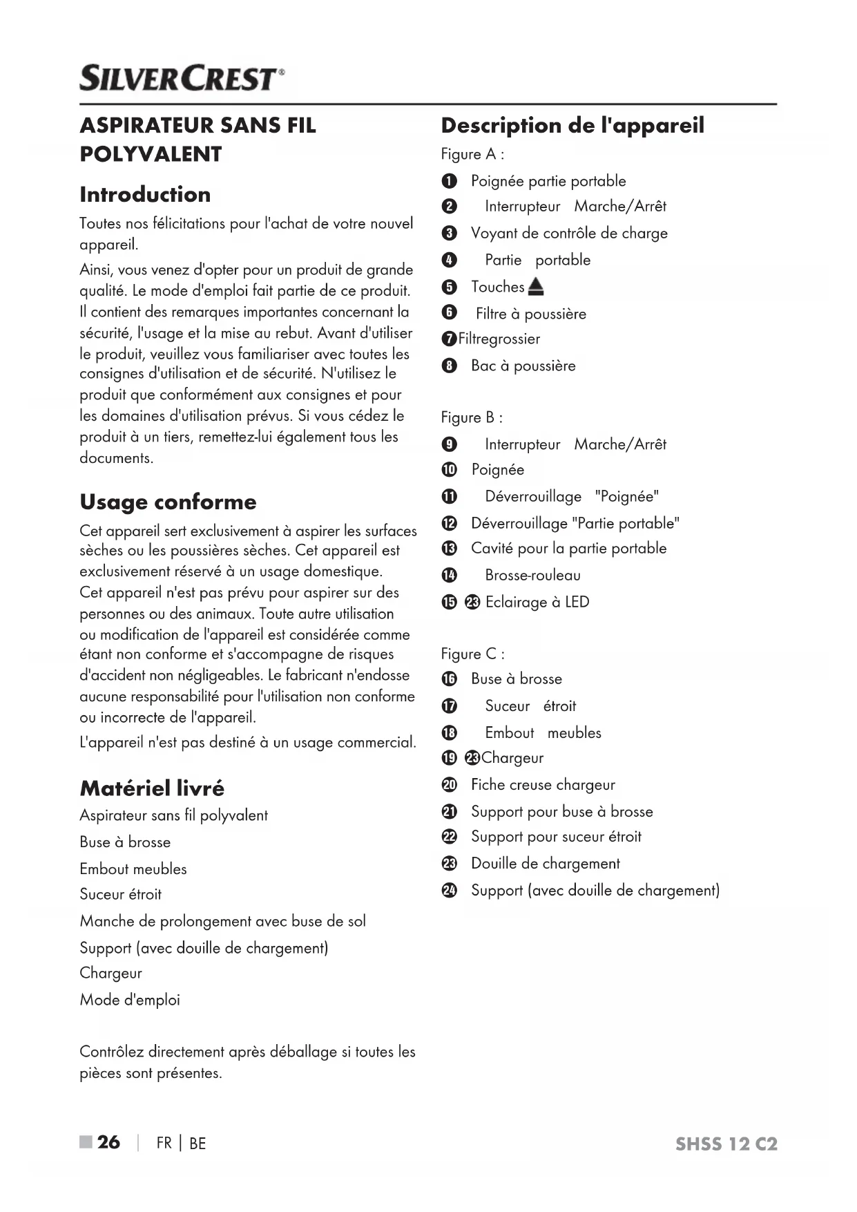Filtre à poussière Filtre grossier Bac à poussière Figure B: Interrupteur Marche/Arrêt Poignée - Déverrouillage "Poignée" 3 Déverrouillage "Partie portable" ! Cavité pour la partie portable . Brosse-rouleau 0 Eclairage à LED Figure C: 6 Buse à brosse 1 Suceur étroit % Embout meubles + Chargeur , Fiche creuse chargeur Support pour buse à brosse / Support pour suceur étroit Douille de chargement " Support (avec douille de chargement)SHSS 12 C2
