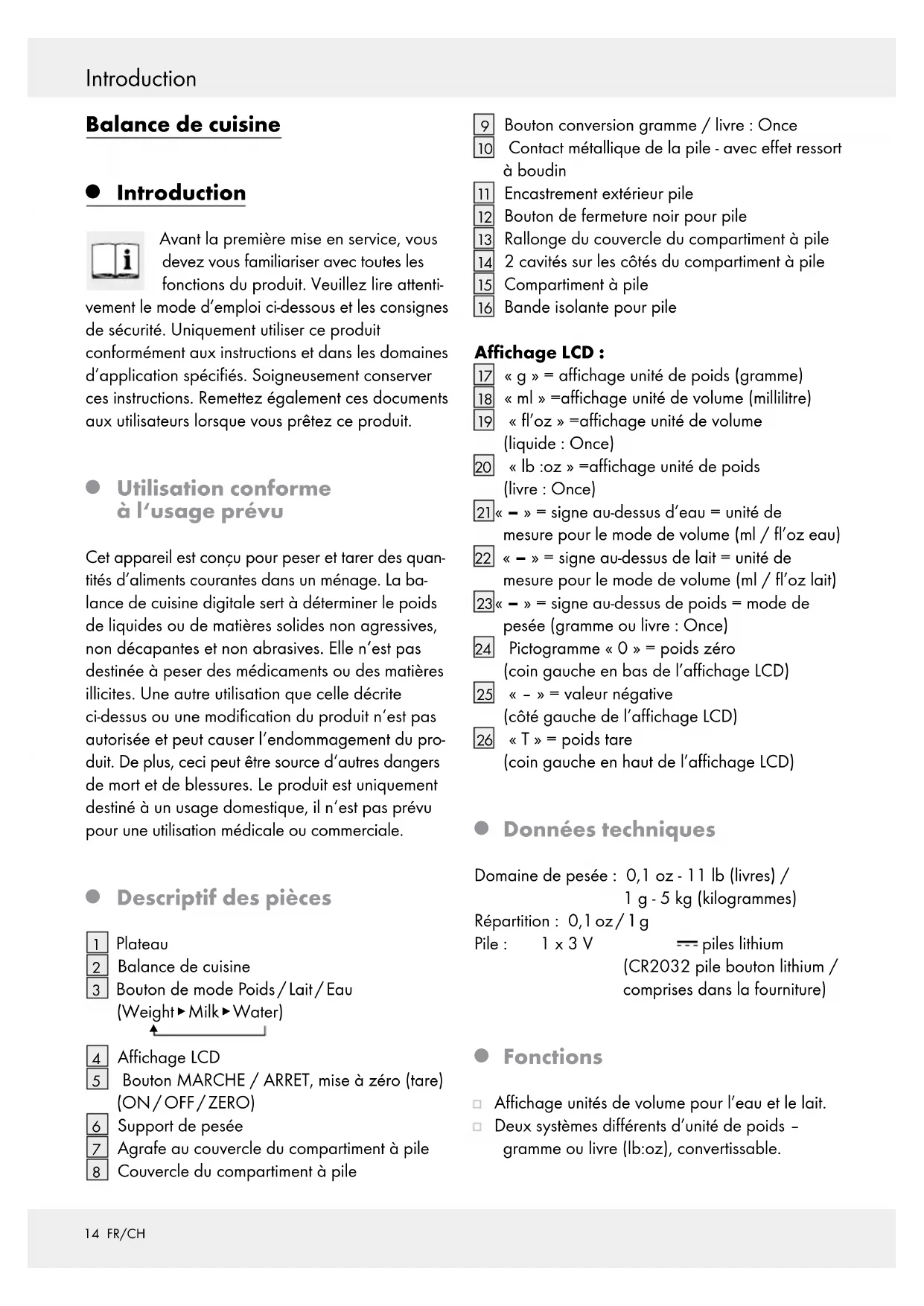 Fonctions Affichage unités de volume pour l’eau et le lait. Deux systèmes différents d’unité de poids – gramme ou livre (lb:oz), convertissable.15 FR/CH Introduction / Indications de sécurité Avertissement en cas de «niveau de pile faible» / «surcharge» par l’intermédiaire d’un affichage pictogramme spécial LCD. Utilisation de capteurs d’appareil de mesure de dilatation de haute précision. Possible de position zéro ou de fonction tare. Fonction de mise hors service automatique pour économiser l’énergie lorsque l’appareil reste inutilisé pendant plus de deux minutes. Mise hors service manuelle – Appuyer sur le bouton MARCHE / ARRET / Zéro